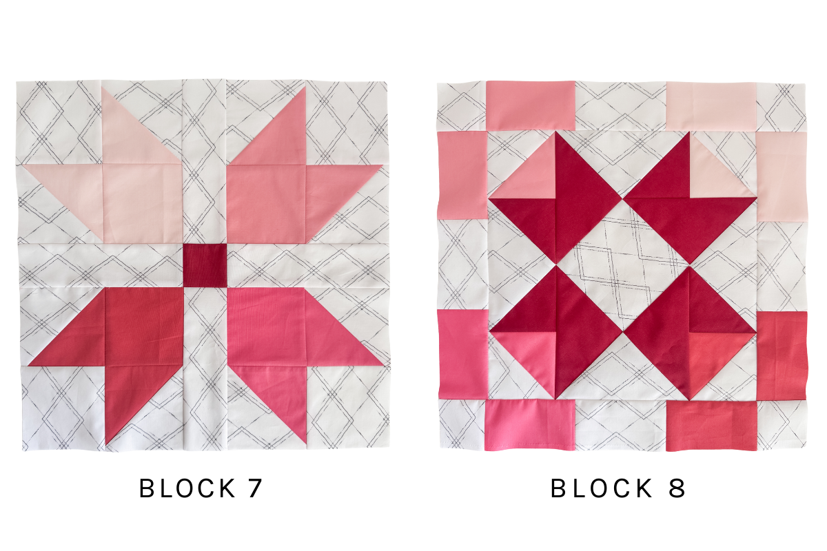 This week we’re making Blocks 7 and 8, and they’re some of the most fun in the whole sampler. Block 7 introduces the disappearing block, where simple cuts transform half-square triangles into a brand new design. Block 8 builds on our HST knowledge with quarter-square triangles and on-point piecing, which open up even more design possibilities.
