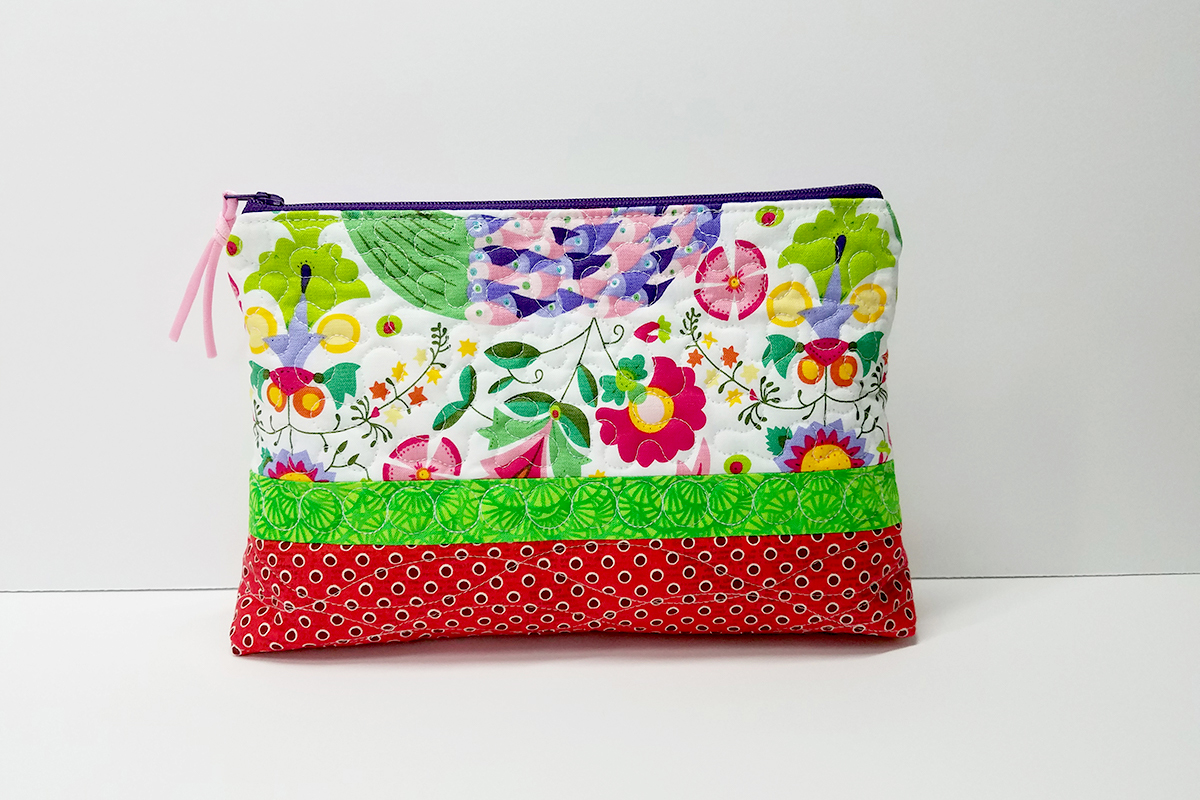 To make the zippered tote, I used my BERNINA 770 QE to quilt the two sides of the bag. After the fabric was pieced, it was sandwiched with the backing and batting. I used cotton fabric for both the piecing and the backing, and used 100% cotton batting. You could spray baste or pin baste the layers together.