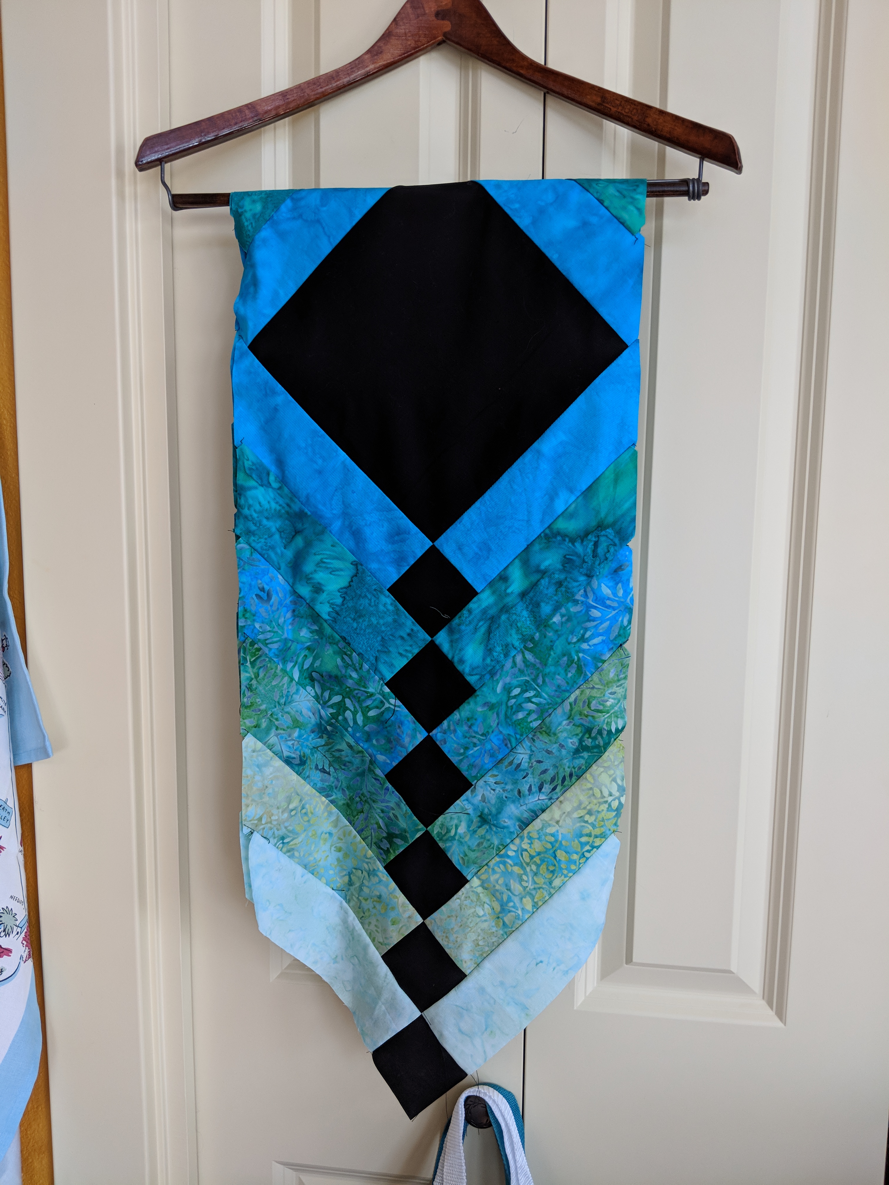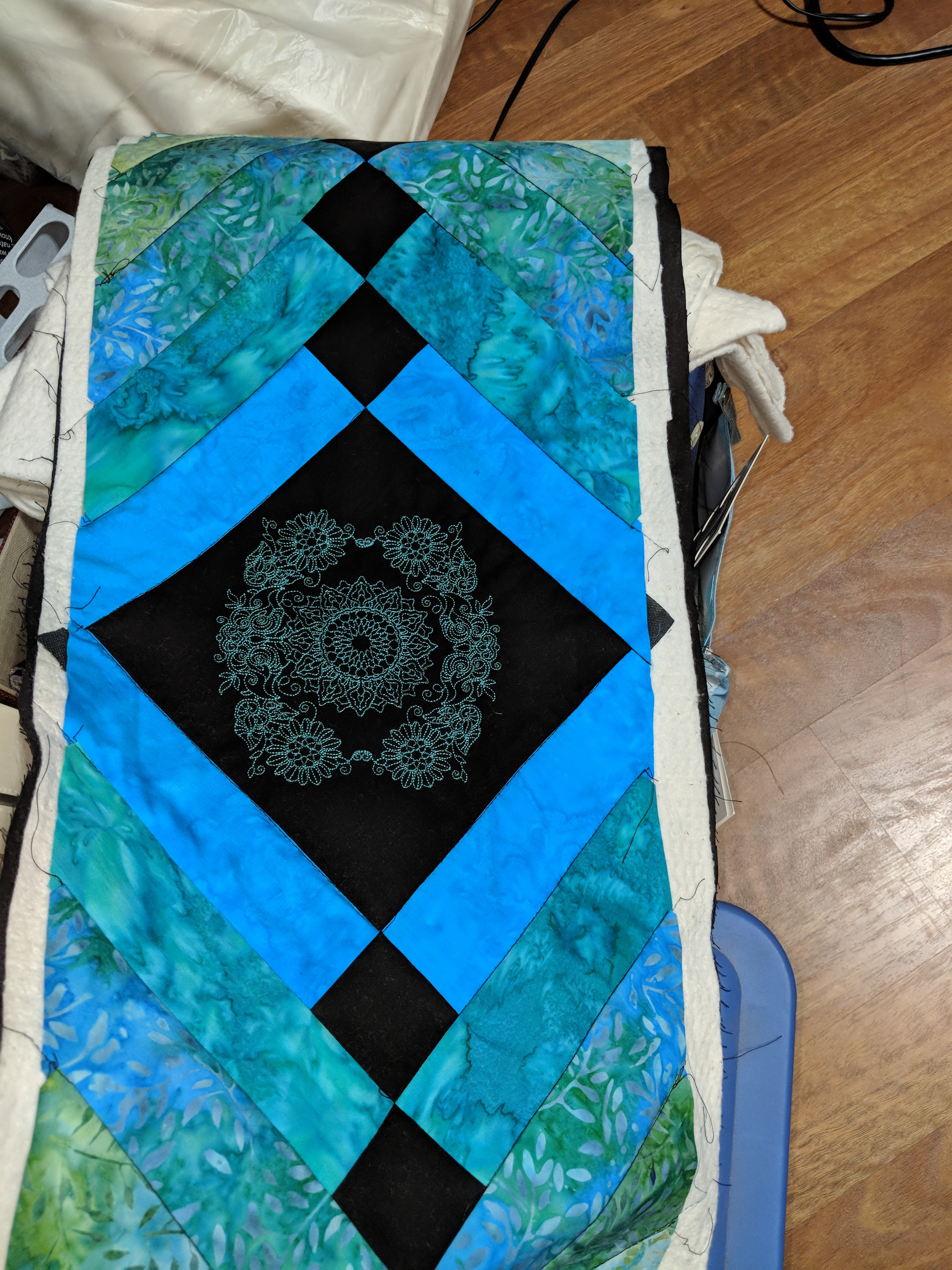 Let’s start the next week with a bit more of procrastination. I’m thinking about my unfinished projects and which one is calling to my soul. Why did I stop? Why is it so hard to push the start button? Let’s start by asking one of my inner voices; Ms. Doctorhill. (Re: name play on famous TV doctor/advisor). As Ms. Doctorhill hangs out her shingle and I hop on the recliner…add to this scene; a cup of tea, or soda or glass of wine. Also add Tillamook Cheese and crackers, because that’s where I live and what I like with my whine. After many hours of discussion, Ms. Doctorhill and I agree that I have three main areas of sewing room procrastination…thereby encouraging my UFO collection (…and it’s not hording if I can still walk around the room and see my sewing machine!)           Reason One: Out of supplies/discontinued fabrics. I have never been blessed to live in an area surrounded by multiple choices in supply stores, craft stores, fabric stores, etc. This (almost) justifies my habit of purchasing more than I need, especially on sale.  No matter how I measure out fabric cuts for projects, invariably I cut wrong, stain beyond functional use, doesn’t match when I get home or that time I dropped four yards of white in the mud. I have switched fabrics (I have enough for A cuts but used B instead), changed my mind (a women’s prerogative) about what I wanted to make (a toaster cover project /material pile will not stretch to make the four placemats) or daughter’s request of …I want a King size Quilt instead of Queen, it’s not too late, is it? So my answer is to make something else out of what you have, or have completed. Blend another similar fabric into the squares, do something to get this monkey off your back! Hey folks, I’m not producing museum quality stuff here; use it, love it, and then pass it on.     Reason Two: Lost Interest. This one took quite a bit of billable therapy hours and lots of cheese. We change, we evolve, life moves forward (add your own esoteric saying here) and I no longer “do” that craft, etc. Pack it up, donate it to thrift shops if you can’t find a family member interested. Let it go, let it go…you got the message? I have been asked many times if I was interested in piecing Auntie’s quilt squares and finishing her lifetime achievement. My sewing is emotionally driven; if I’m not “feeling” it, it doesn’t get done. This is why I am not in business or have an Etsy account. Let it go, I have to get back into the sewing room so my kids aren’t left with a pile of unfinished projects. Reason Three: Lost Momentum AKA the emotional rollercoaster we call Life. I bought everything I needed. Cutting out strips for my latest project went perfectly, assembly even better. But all momentum stopped and there it hangs, for the last few months. What went wrong? Life in general. My husband woke up in pain, several doctor appointments spread out over the next few weeks leads to surgery. Surgery leads to home care, time passes and I have other time sensitive projects that take priority. Hence how the future (but as of now unfinished) table runners have been hanging from the closet doors. I could add a list of other excuses (I don’t like the colors anymore, etc.). A little piece of my psyche thinks that if I return to the table runners, my husband may trip and fall…bad juju. More important, I truly believe that unfinished projects haunt the soul (let it go or work on it) and I really planned on finishing it early next year. For you guys, I’ll work on it this week…and a few Halloween thingies. Now back to the table runners. The last few days have gone well. I’m a little disappointed in my (lack of precise) centering. Which brings me to another of my favorite sayings: Do you want it perfect or do you want it done? It’s not a 2-for1 deal in My Shiny Place. There was one glitch, which brings on another one of my sayings: 95% of my sewing machine problems are operator errors. While working on the binding, I figured out a new way (new to me!) to machine bind and would love to share it, but again, another time. Pictures taken, uploaded, etc. and these projects are put to bed! I will leave the readers with a question. Both centers of the table runners have an embroidery pattern that can be found in two different OESD collections, which collections are they from?