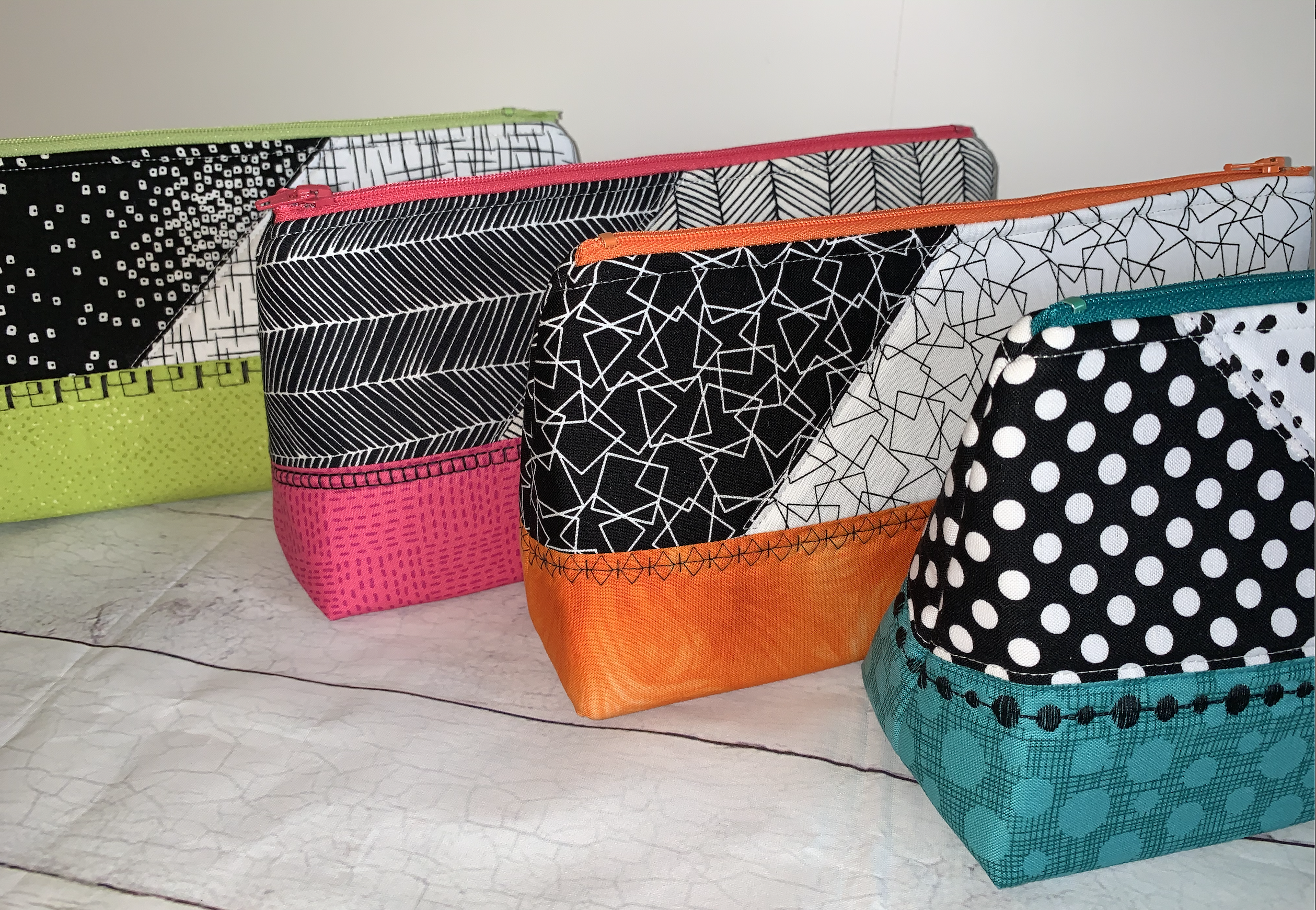 I used my BERNINA 560 decorative stitch function to add detail and interest to my travel/cosmetic bags. These decorative stitches are cute and there are so many to choose. I used black Aurifil 50wt thread. Give it a try. It is fun and easy to use.