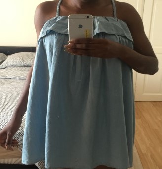 So I went into an outlet store and saw this gorgeous sky blue dress. I get really excited because I have finally found me an off shoulder dress and it looks like it is going to fit, so obviously I don’t bother trying it on. When I get home, I realize this isn’t an off shoulder dress, it’s a strappy dress for ten year olds and I’m thinking to myself, how did I buy an outfit and not check the sizing? Now I had to think of a way to make this unsolicited mistake into what I really wanted. This is where it gets interesting.