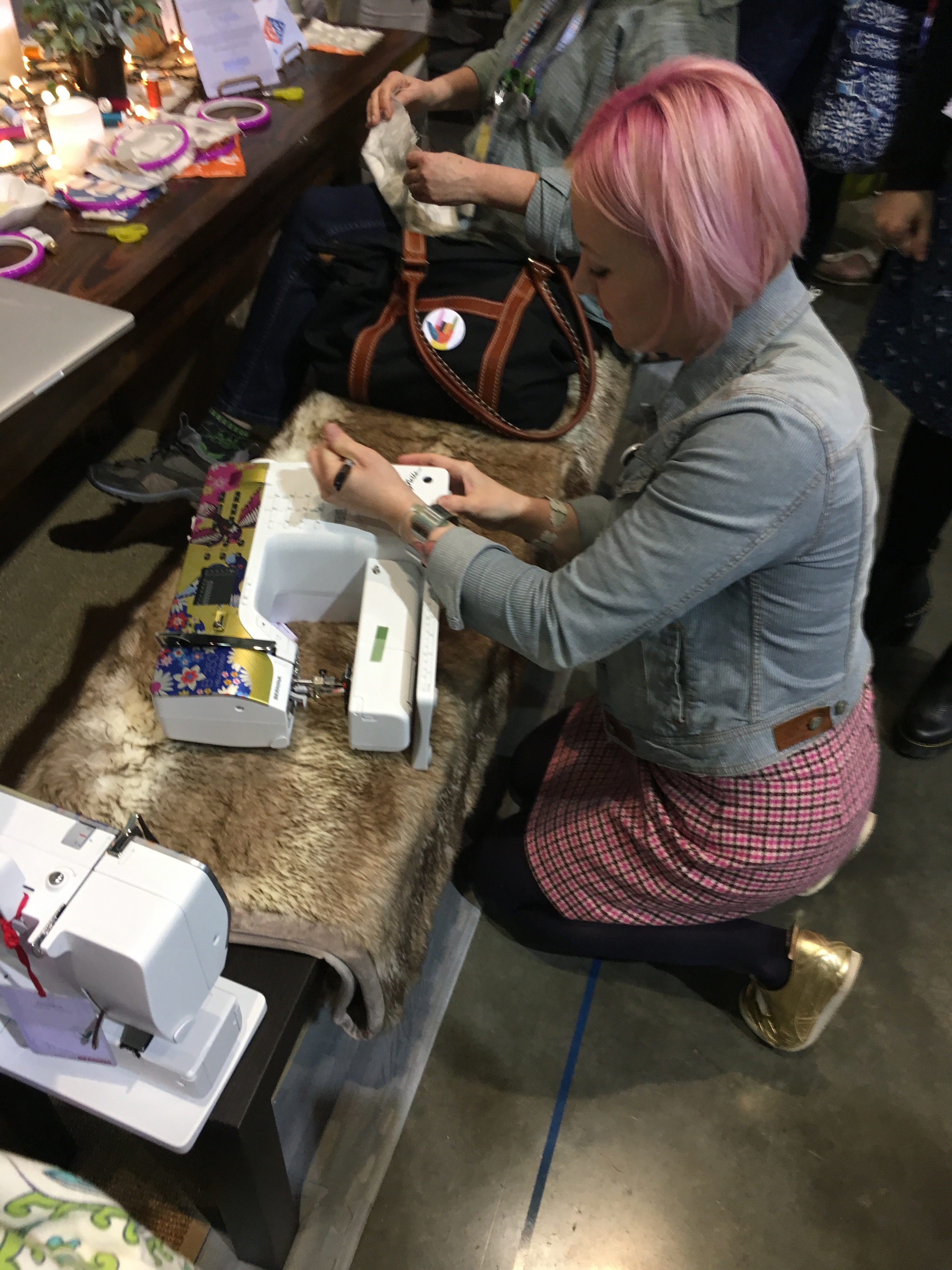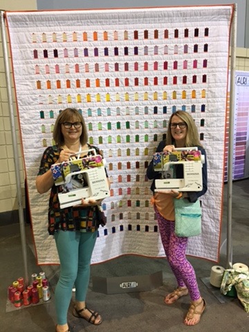 I met my first Bernina at QuiltCon 2017 in Savanah, GA. My LSQ, Augusta Sewing Center, was the Bernina vendor at the show so my sister and I had a tendency to spend a couple of minutes in the booth every time we passed by. We kept petting the cute little C+S machines that were introduced at the show and eventually my sister became interested in taking one home. Well, that got me thinking and we both ended up taking one home! But first, we carried our machines to the C+S booth and got them signed! Then we hated to the Aurifil booth and took photos in front of their spool quilt.