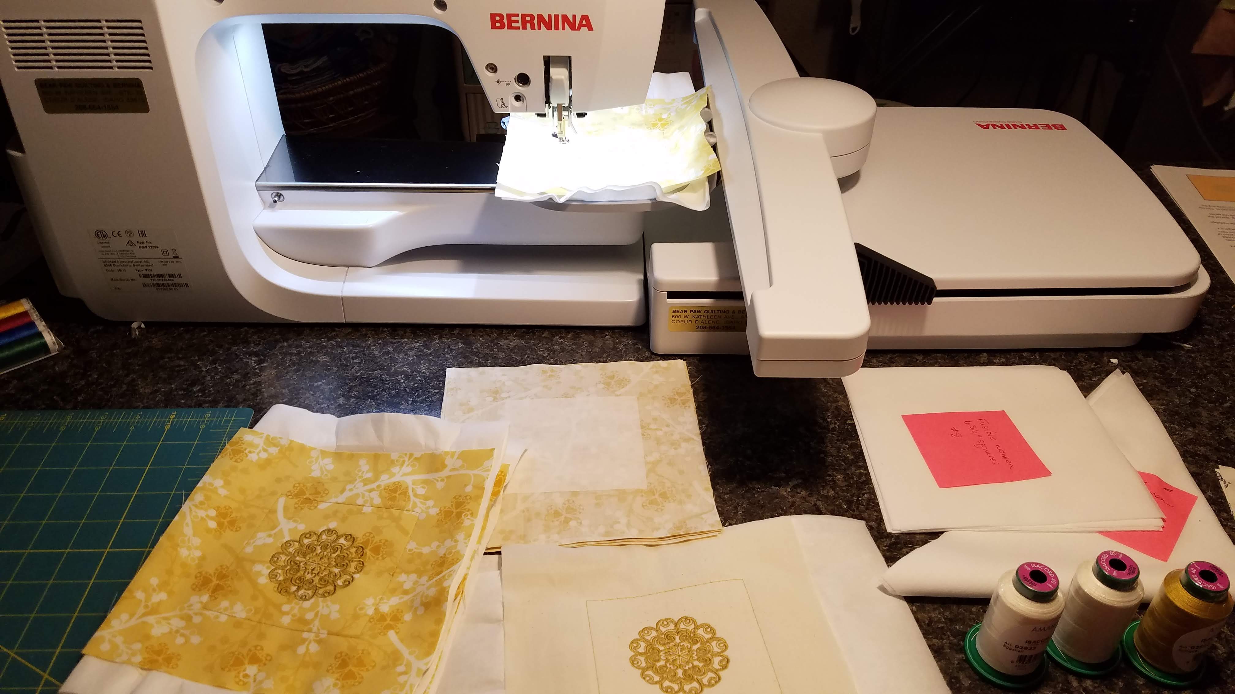 Had a few starts and stops as I continue to figure out this embroidery module, but it is really coming together. So glad I made a practice piece on muslin first! The cornerstone medallion is so beautiful and much smaller than I was imagining. I couldn’t find the right metallic thread, but am pleased with the Isocort 0721. My little production line is working great — they are so pretty!