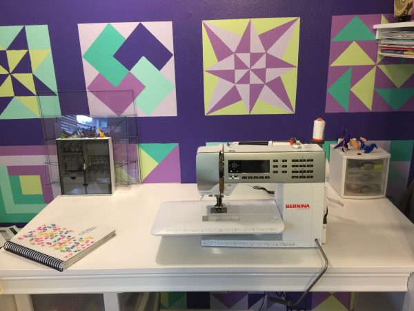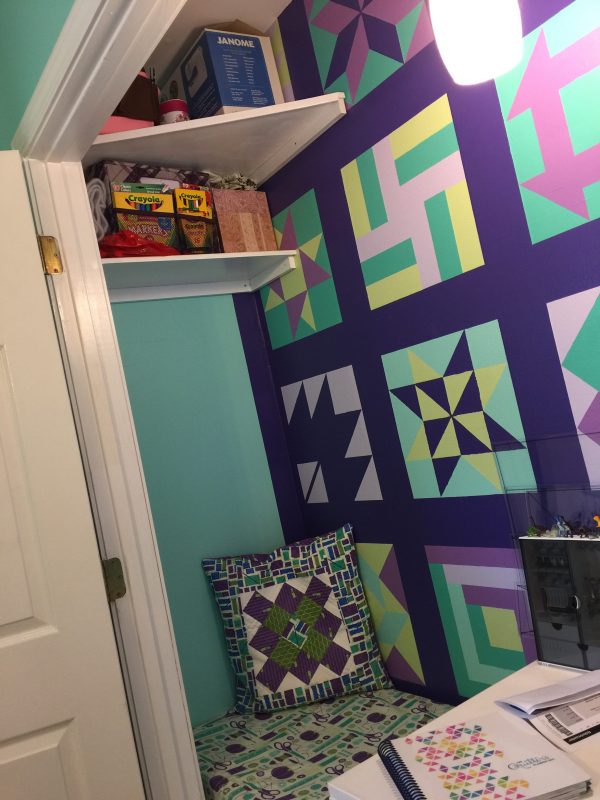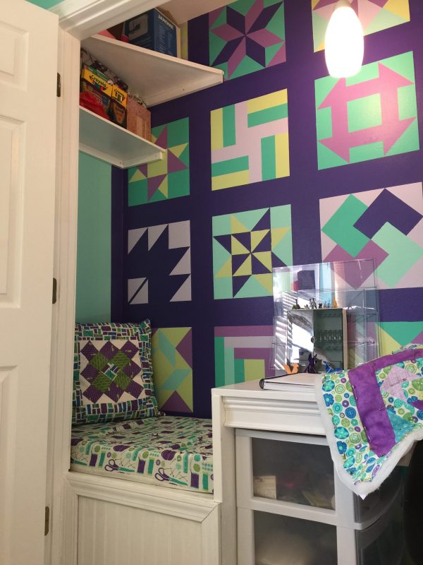 My Quilting Closet is my very special sewing place. The moment we bought the house and I saw the three-foot wide double doors, I knew I wanted to make this space my Narnia. We gutted the closet, I picked my color scheme from a line of fabric, and I went to work painting the quilt squares on the back wall. My husband built me the desk and “reading nook”. He added the shelves, the storage under the seat, and the peg board to make the most of the tiny space. I spend hours at a time either sewing at the desk, or planning my next quilt from the reading nook. It’s not normally this neat, because it’s usually covered in quilt tops or fabric. I still have plans to add more accessories and pillows for reading nook, but when my husband bought me my Bernina this past Christmas, it made my sewing room complete! I’m in LOVE with my Quilting Closet!