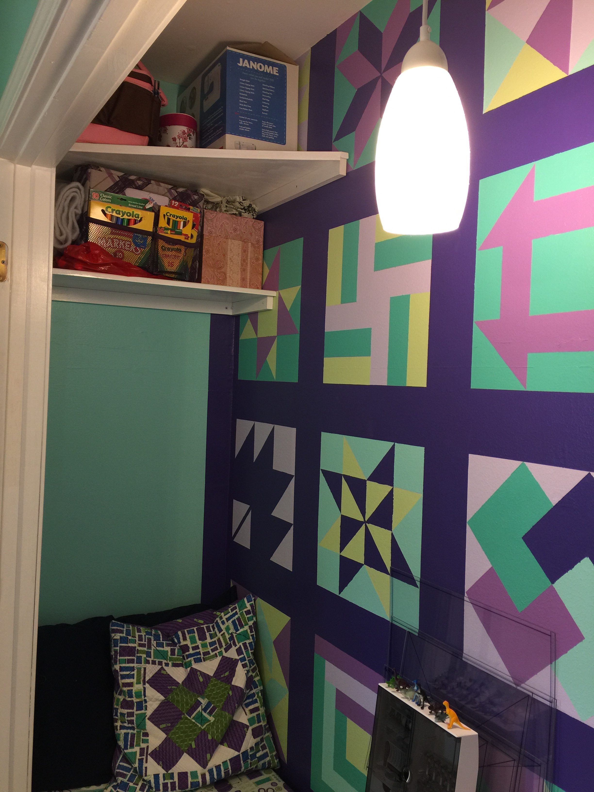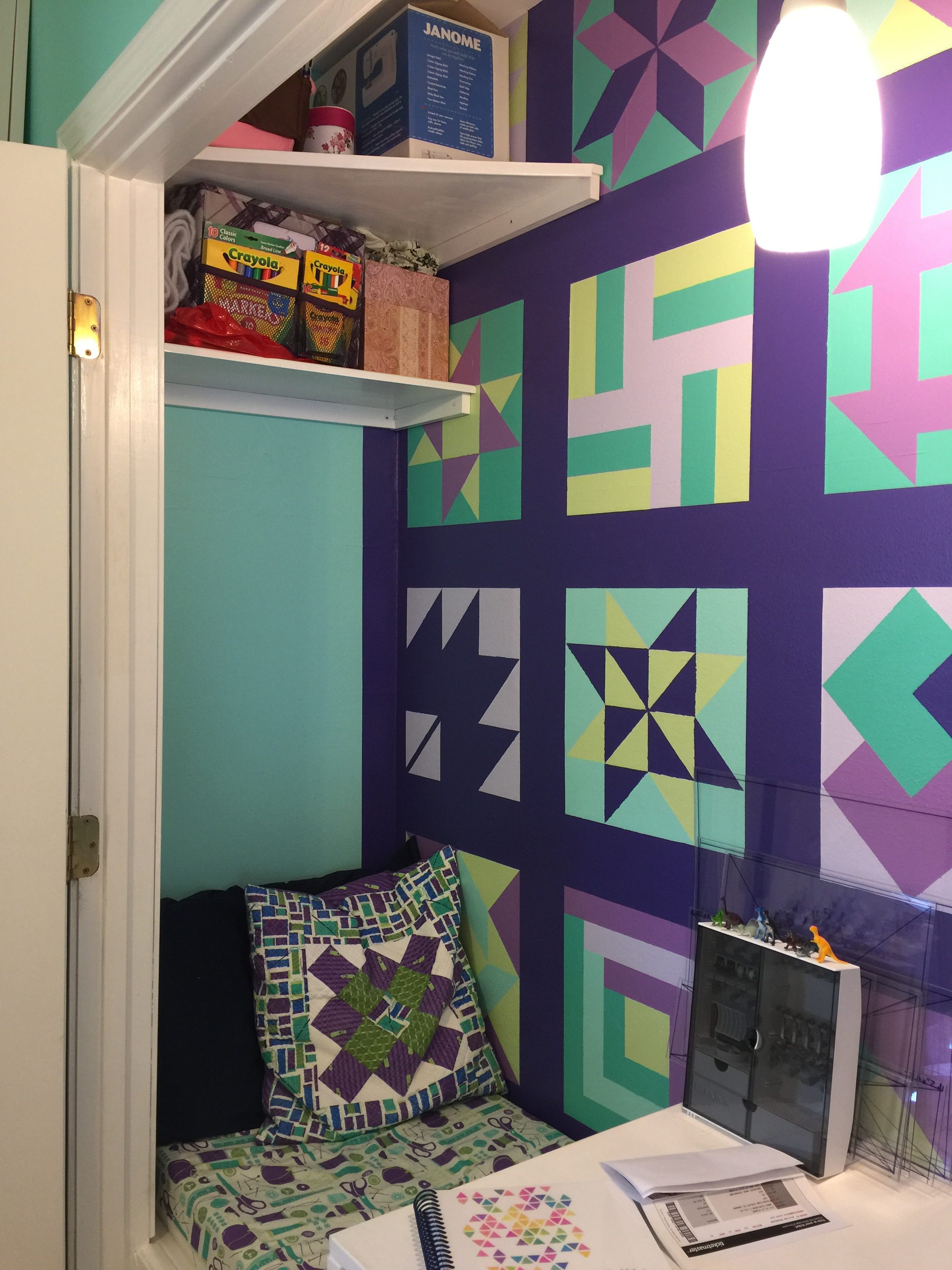 My Quilting Closet is my very special sewing place. The moment we bought the house and I saw the three-foot wide double doors, I knew I wanted to make this space my Narnia. We gutted the closet, I picked my color scheme from a line of fabric, and I went to work painting the quilt squares on the back wall. My husband built me the desk and “reading nook”. He added the shelves, the storage under the seat, and the peg board to make the most of the tiny space. I spend hours at a time either sewing at the desk, or planning my next quilt from the reading nook. It’s not normally this neat, because it’s usually covered in quilt tops or fabric. I still have plans to add more accessories and pillows for reading nook, but when my husband bought me my Bernina this past Christmas, it made my sewing room complete! I’m in LOVE with my Quilting Closet!