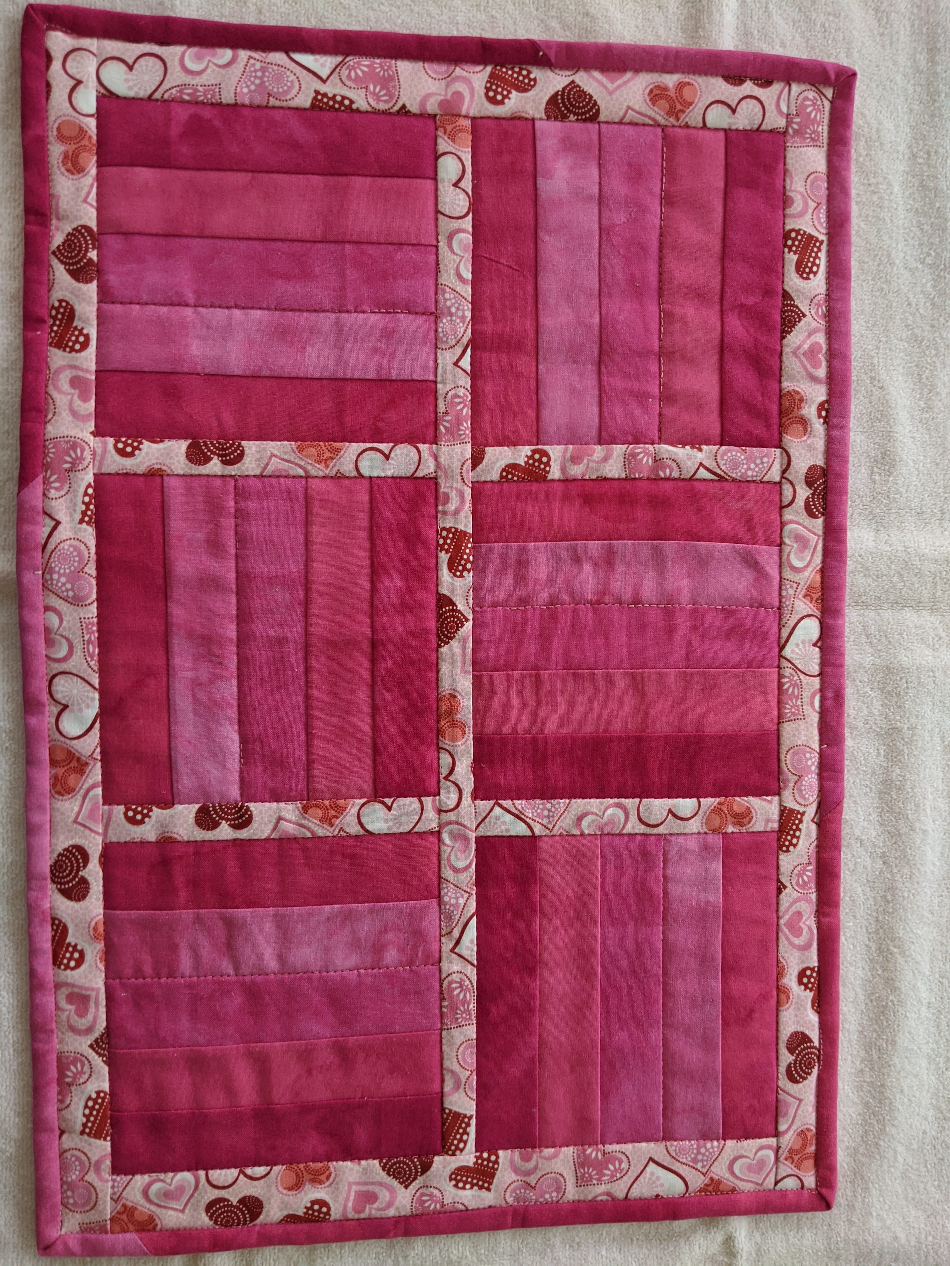 This patchwork kennel quilt consists of six 5 inch strip pieced squares that are joined by half inch sashing. The top and bottom borders are 1 inch strips and the sides borders are 1 1/4 inch strips. The quilting is stitch-in-the-ditch. The fabrics are from my valentine stash of fabrics. This small quilt was a fun, quick and enjoyable project. I am happy to have participated in this campaign.