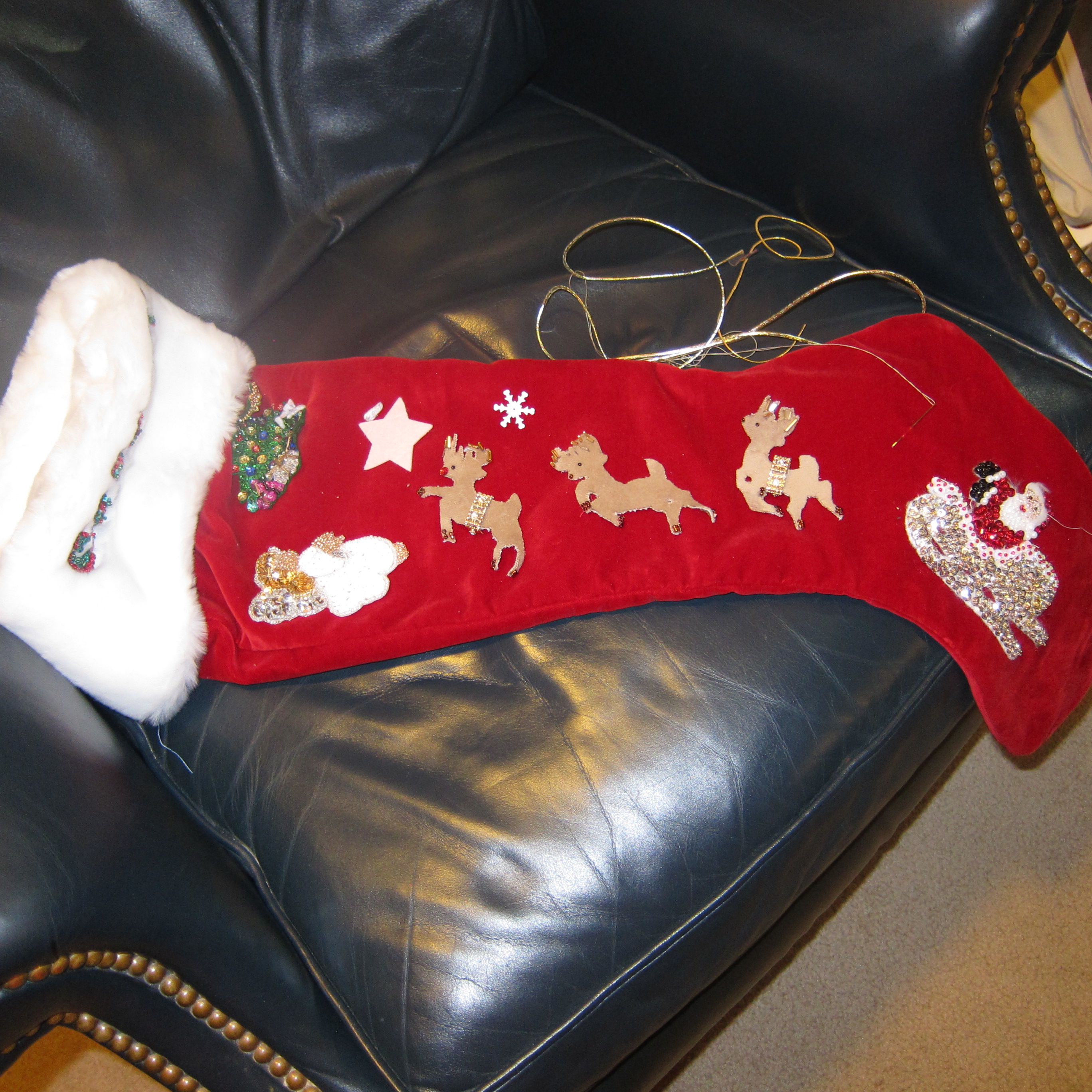 The pictures of neat sewing spaces make me embarrassed to show mine– too crowded and really messy. But out of that mess have come some special projects such as this Christmas stocking for my grandchildren– made from a hand-drawn pattern my aunt made and used to make one for me many, many years ago.