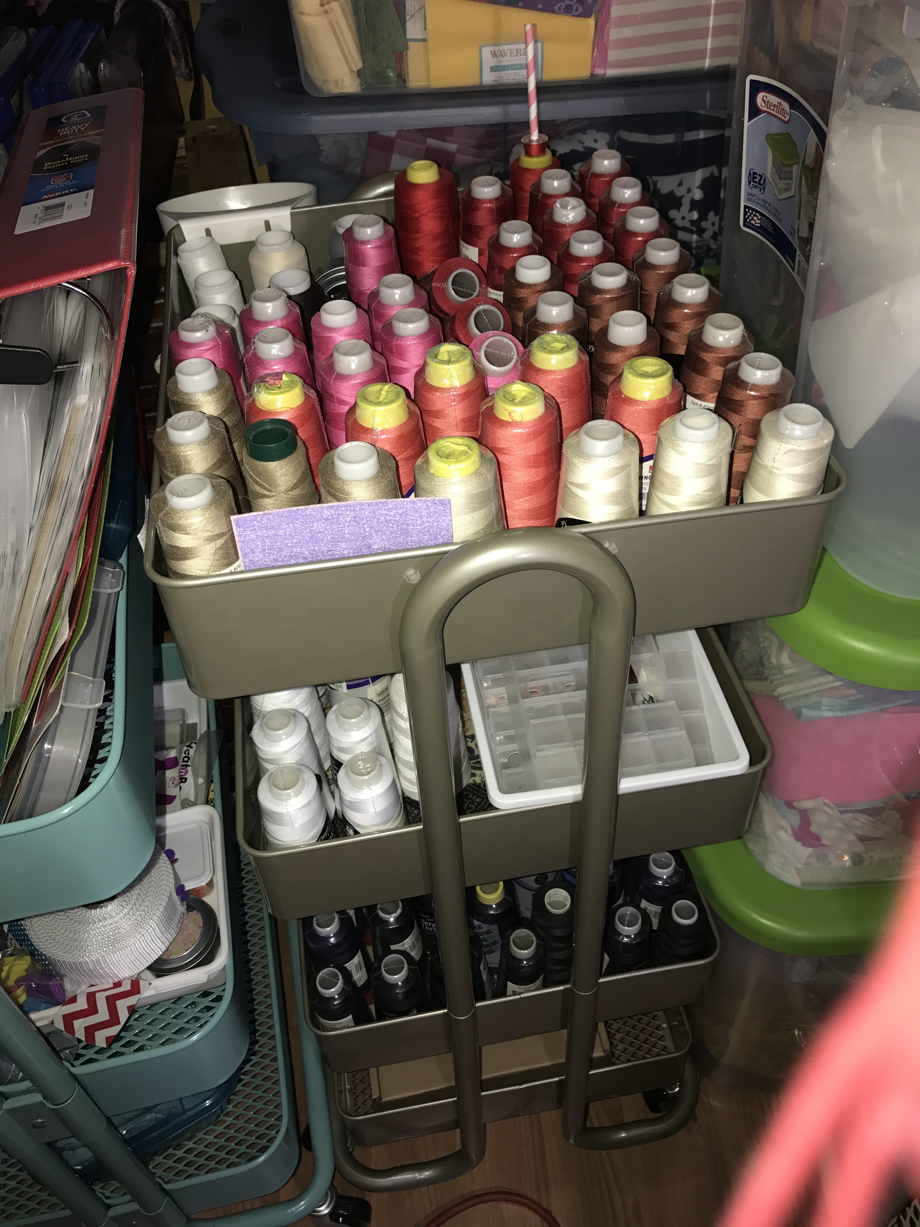 This is my humble sewing space. I have lots of fabric in plastic bins. I’m a self taught beginner and a single mom. So I can’t afford a Bernina sewing machine. They’re too expensive for my budget. I love sewing because my mom used to sew and she passed away from cancer four years ago. I inherited her sewing machine and started to teach myself how to use it.