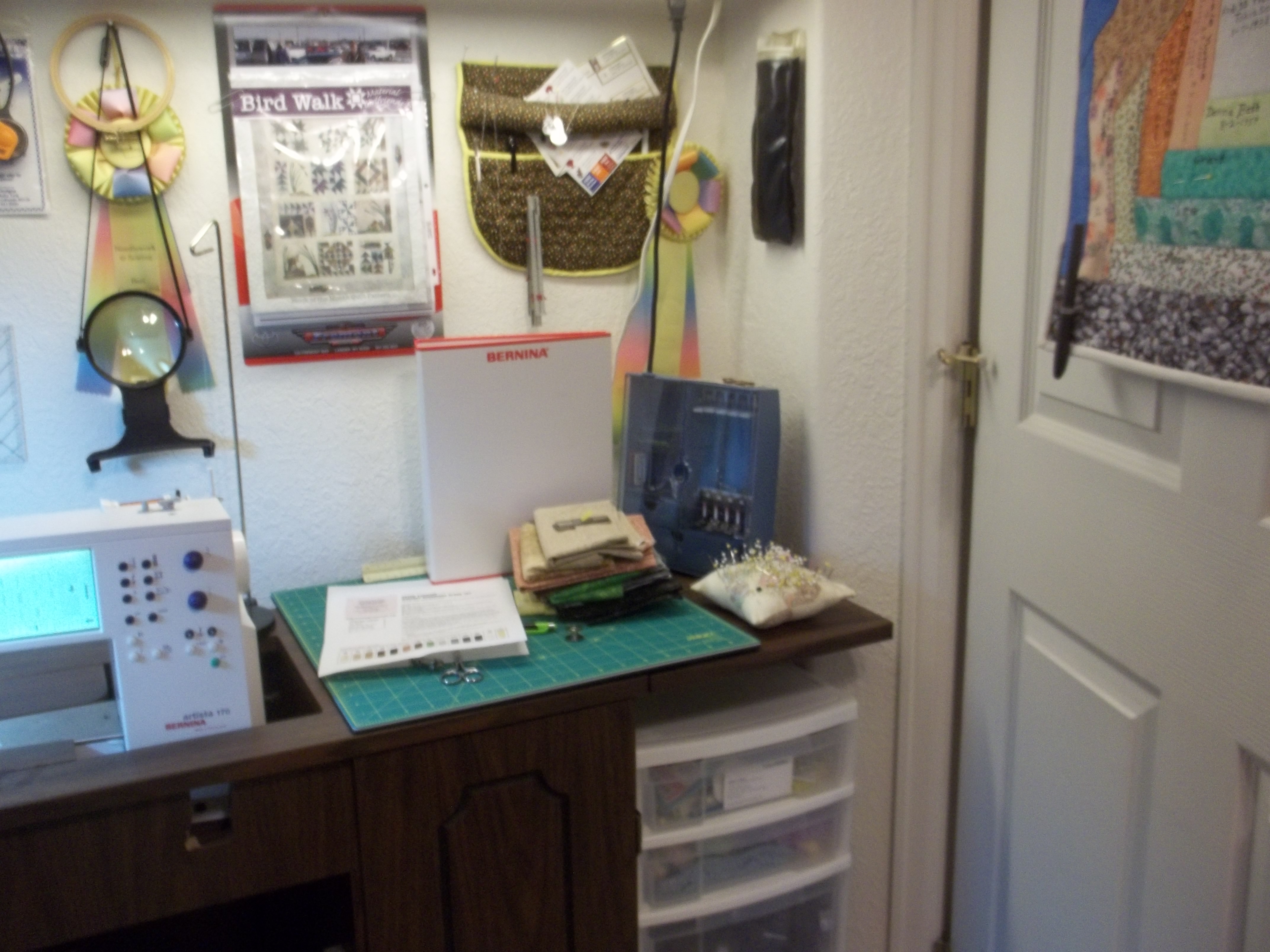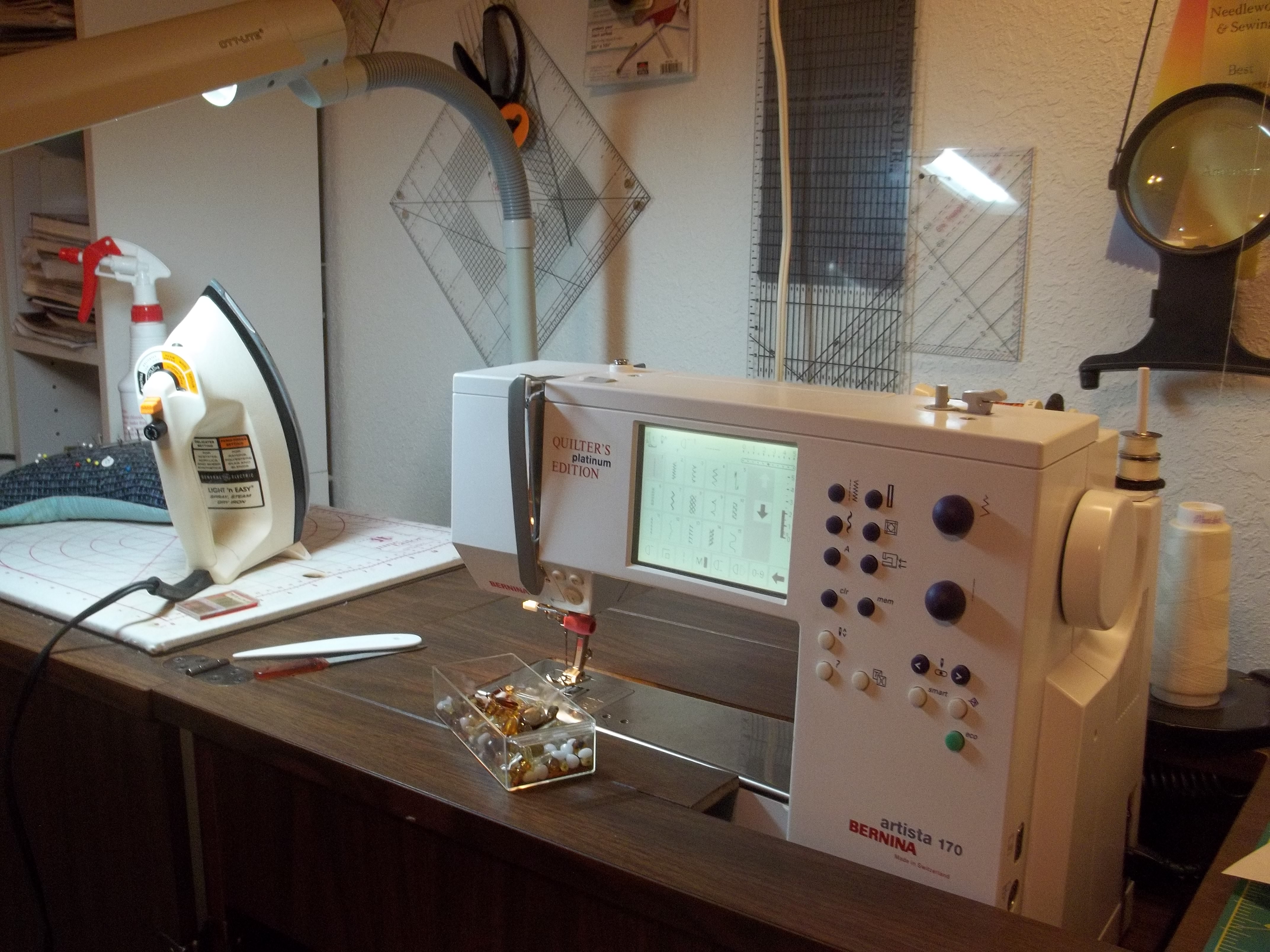 I use my second bedroom as my sewing room. I still have my sewing cabinet that we bought with my 830, have used it for the 930 and also my Artista 170 just changing the board around the open arm have been all different size arms, can still bolt it in and cut the opening for the third arm that I love and use often. In my quilting I will move the machine to the dining room table. Have loved all my machine’s. Have tought many classes, the one I enjoyed most was freehand embroidery. Now I am into quilting doing mostly paper piecing. After having a stroke in 2015, my best days are at the sewing machine.