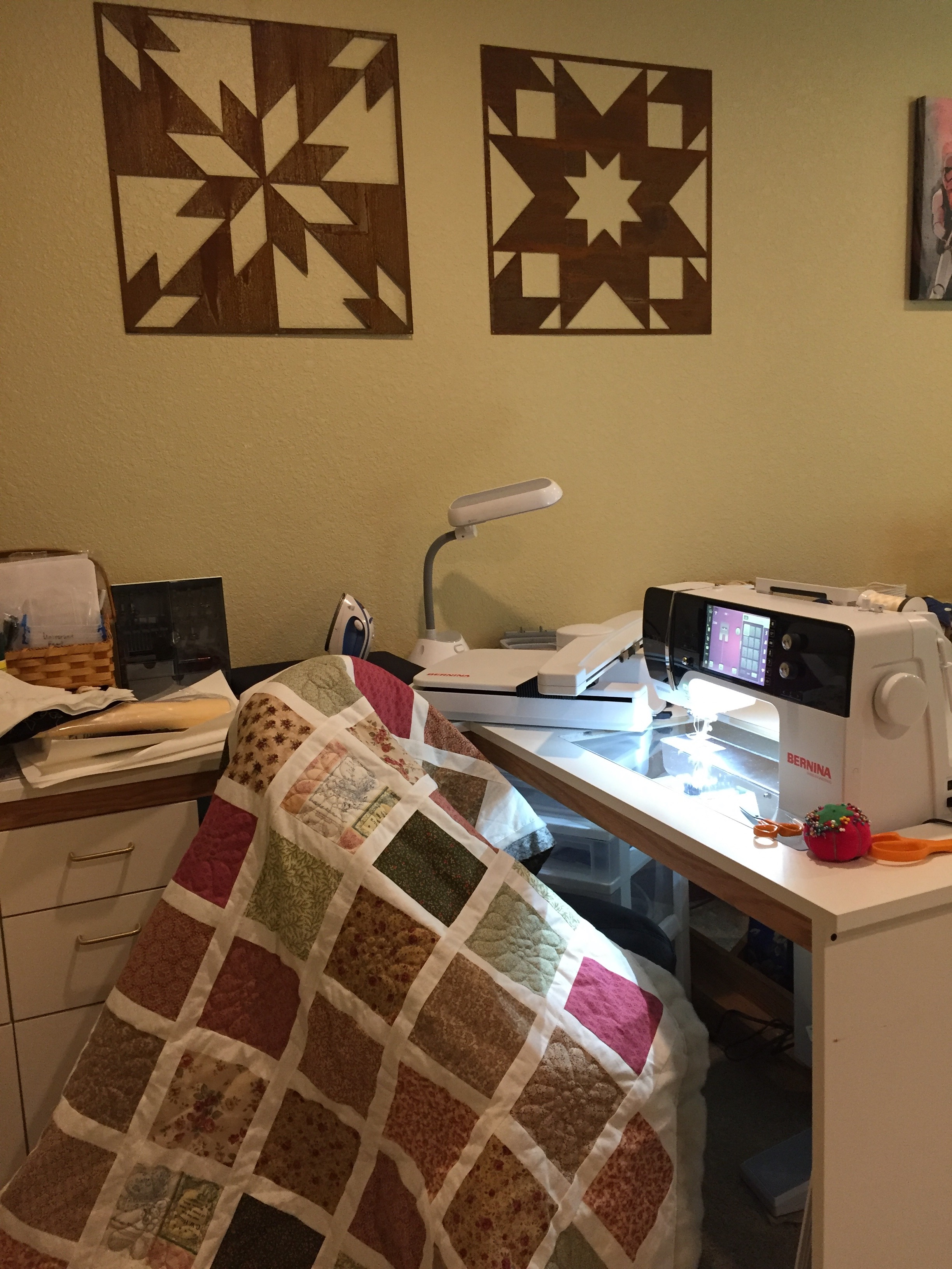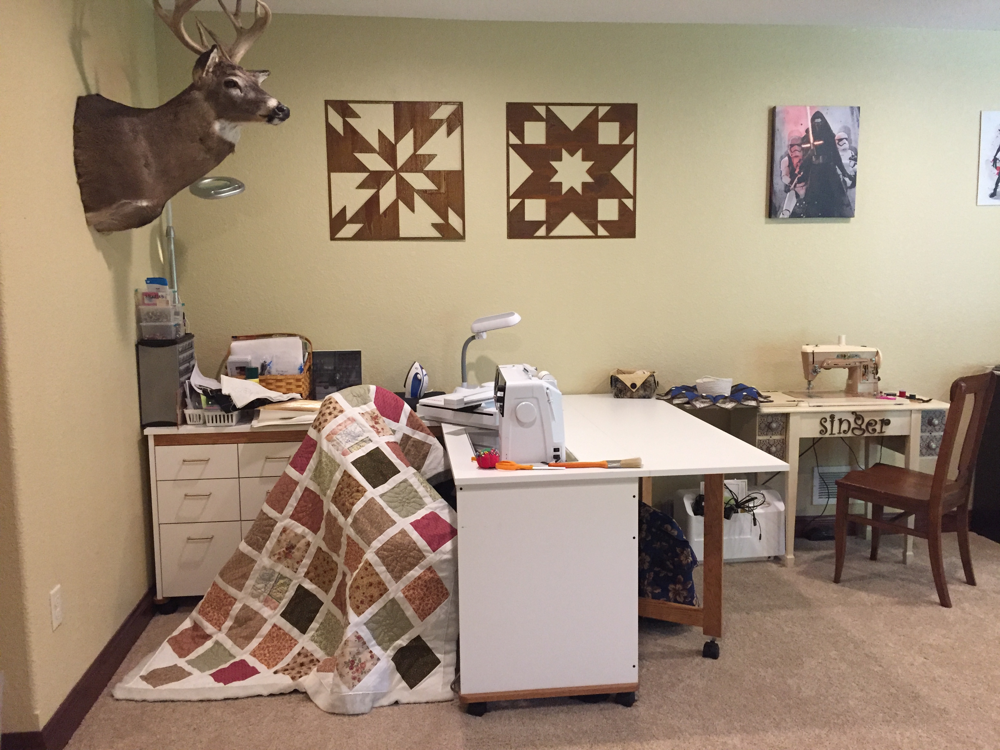 It’s wonderful to have a door to close when you want to hide the mess! I love the wooden quilt block art as well. Nice space!