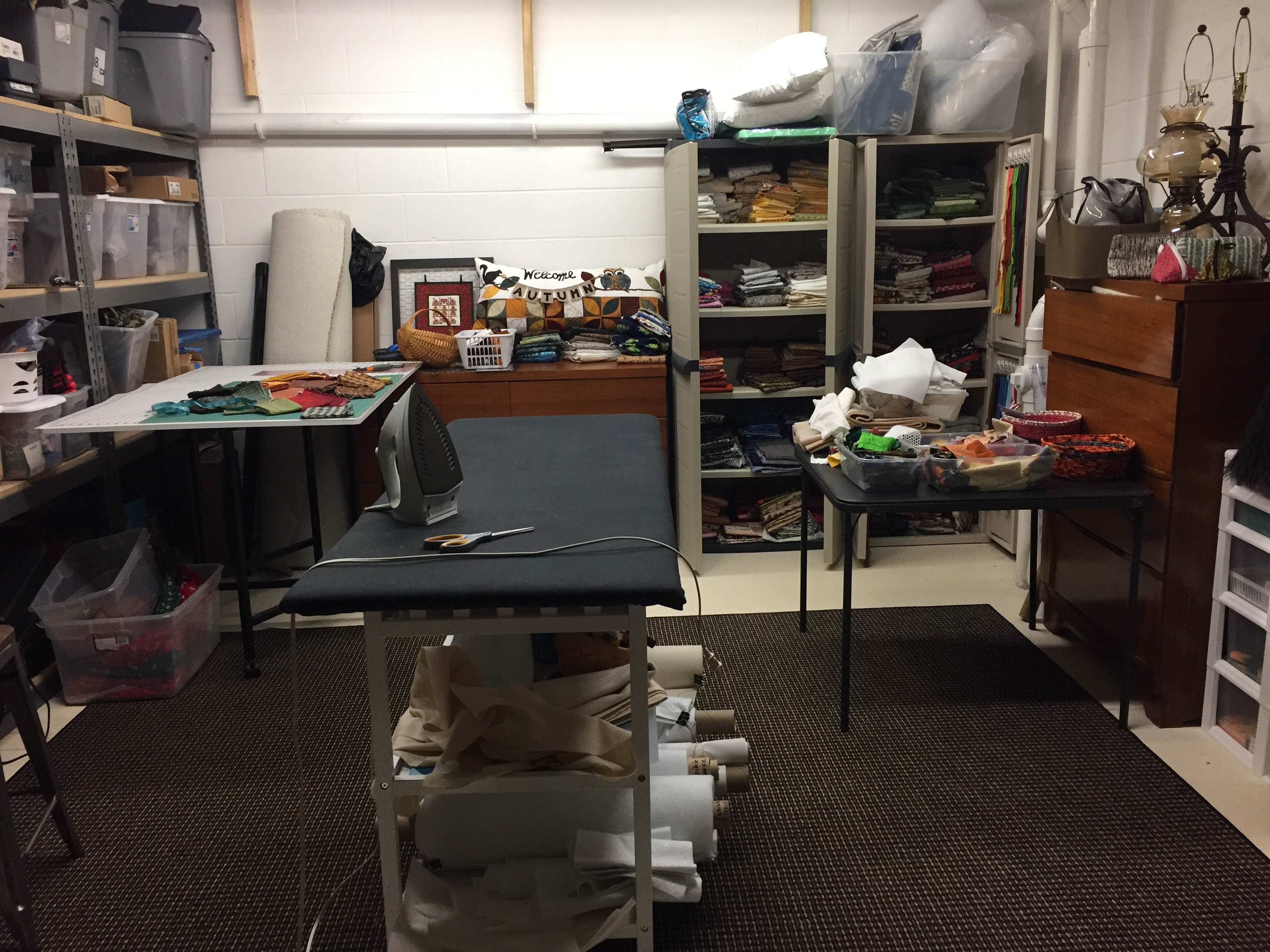Keep my fabric, cutting table and ironing table in storage room (out of sight so I can make a mess and no one can see it!) 🙂