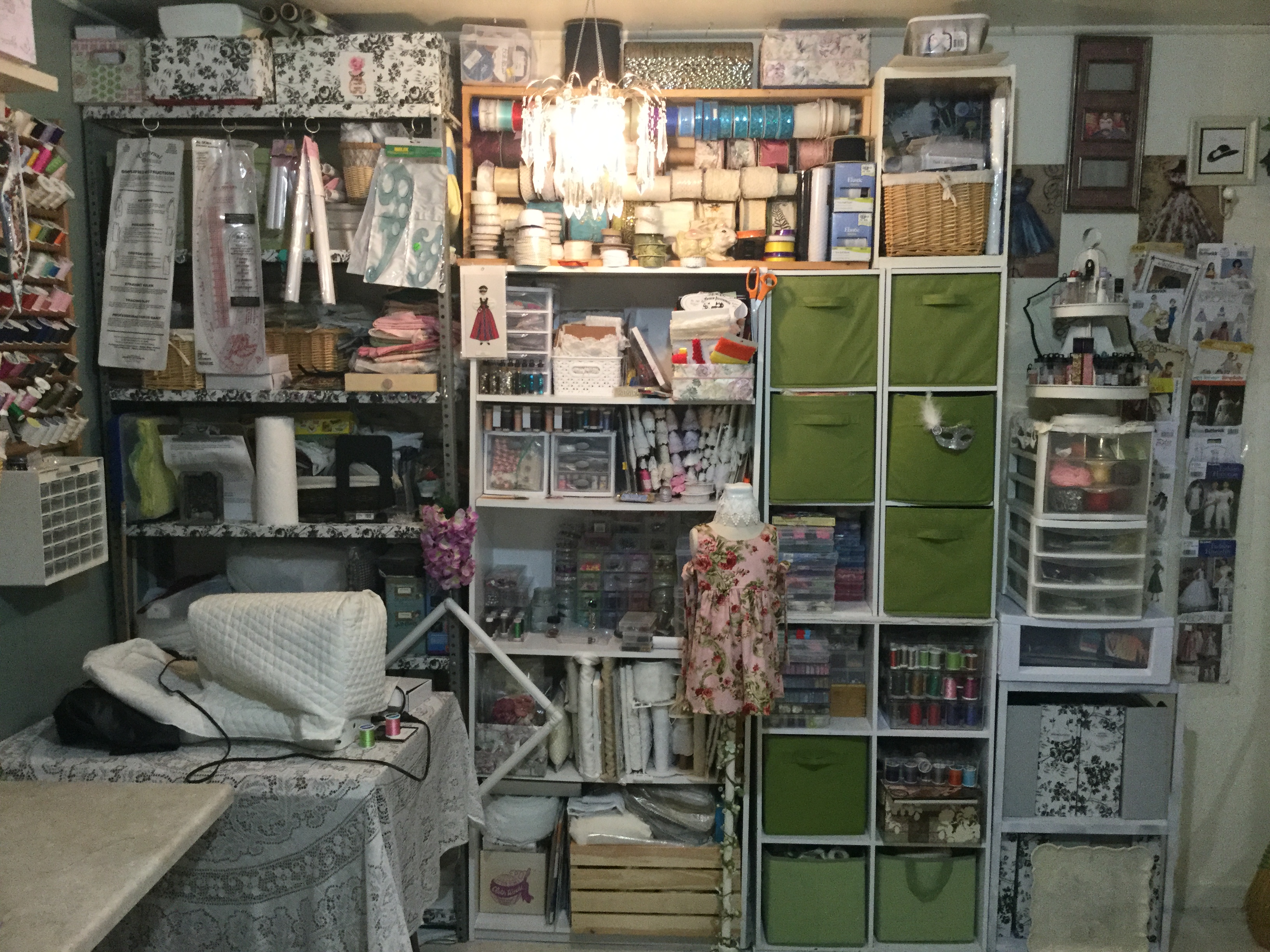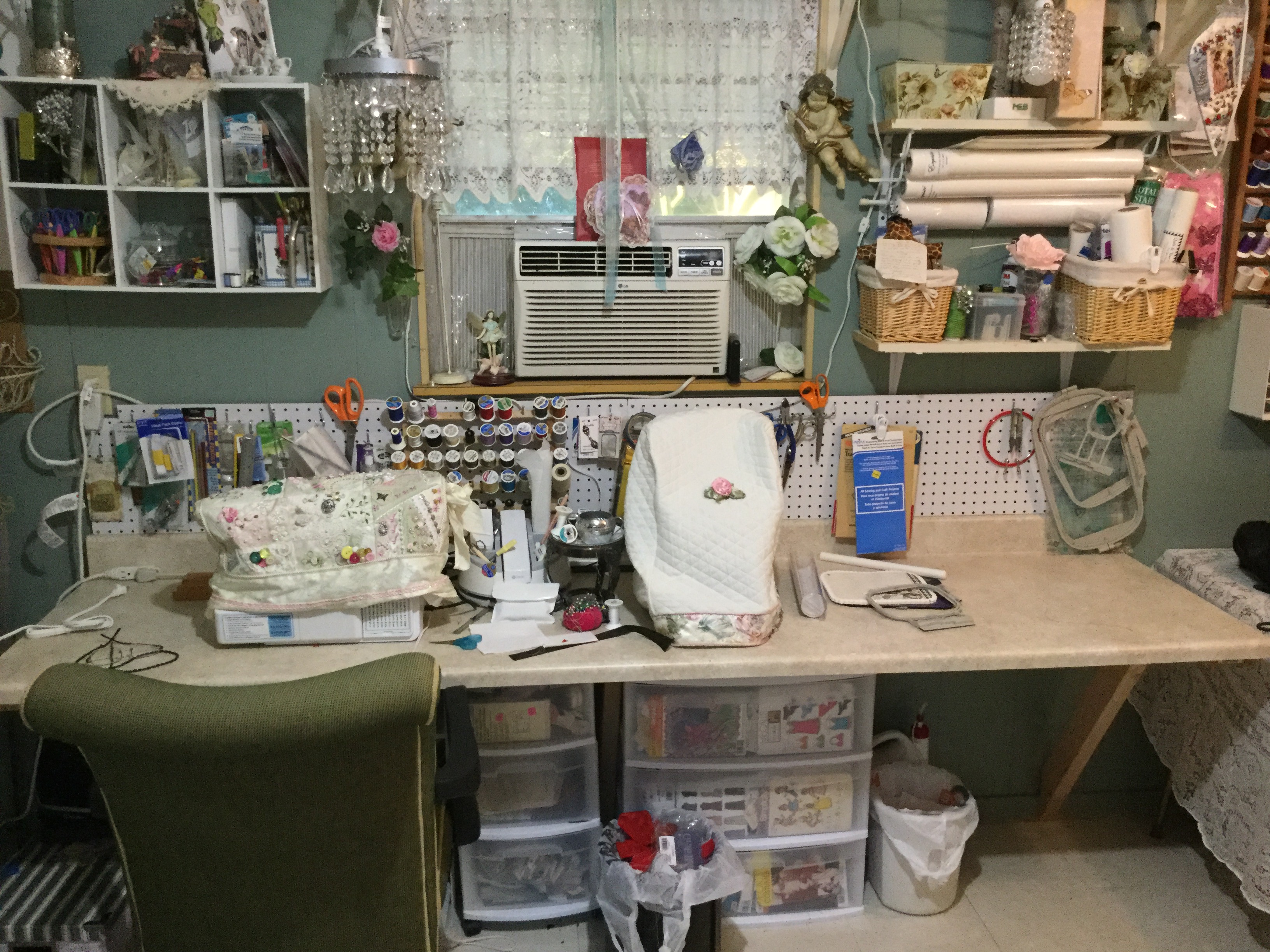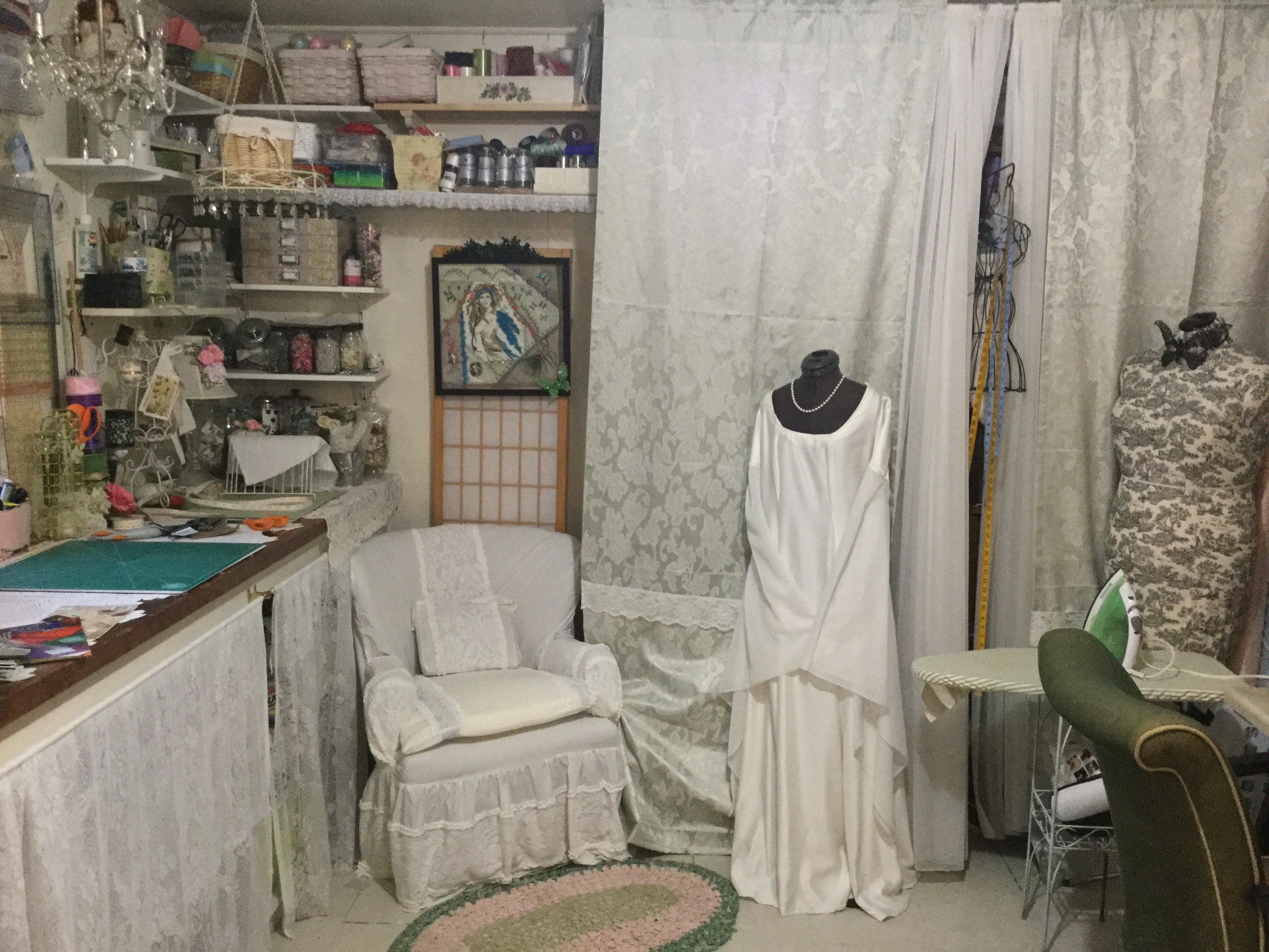 This is my she shed/ work room. When my husband and I bought our home there was this old garden shed in the back yard it was kind of run down but it had electricity running to it. My hubby wanted it for a work shop and I wanted it for a sewing space. So the only thing to do was flip a coin for it and….I won.  It has taken me 2 years to get it to this point. I scrubbed everything top to bottom ,put tile put on the floor, lots of paint. Last month my wonderful hubby added the counter top on one wall for my sewing machines. Now all I have left to do is bring down my computer and set it up.Behind the curtain is floor to ceiling fabric .It is now called the cottage, I spend every chance I get down there ,either working or sitting in my chair planning  my next project .
