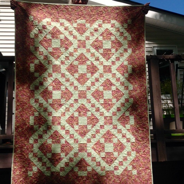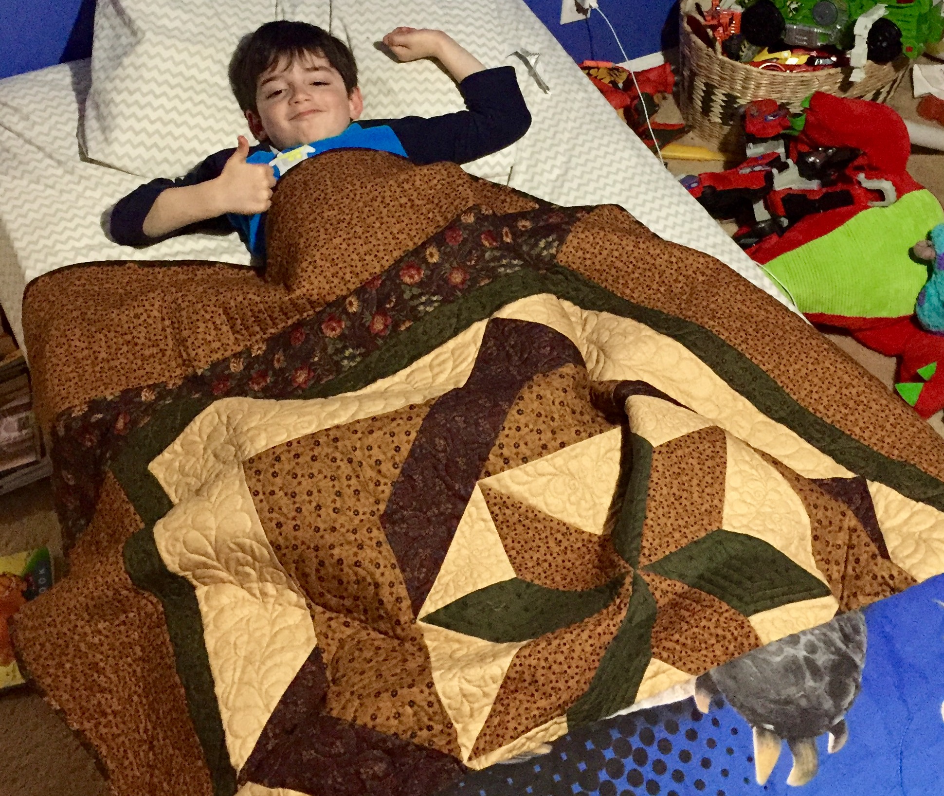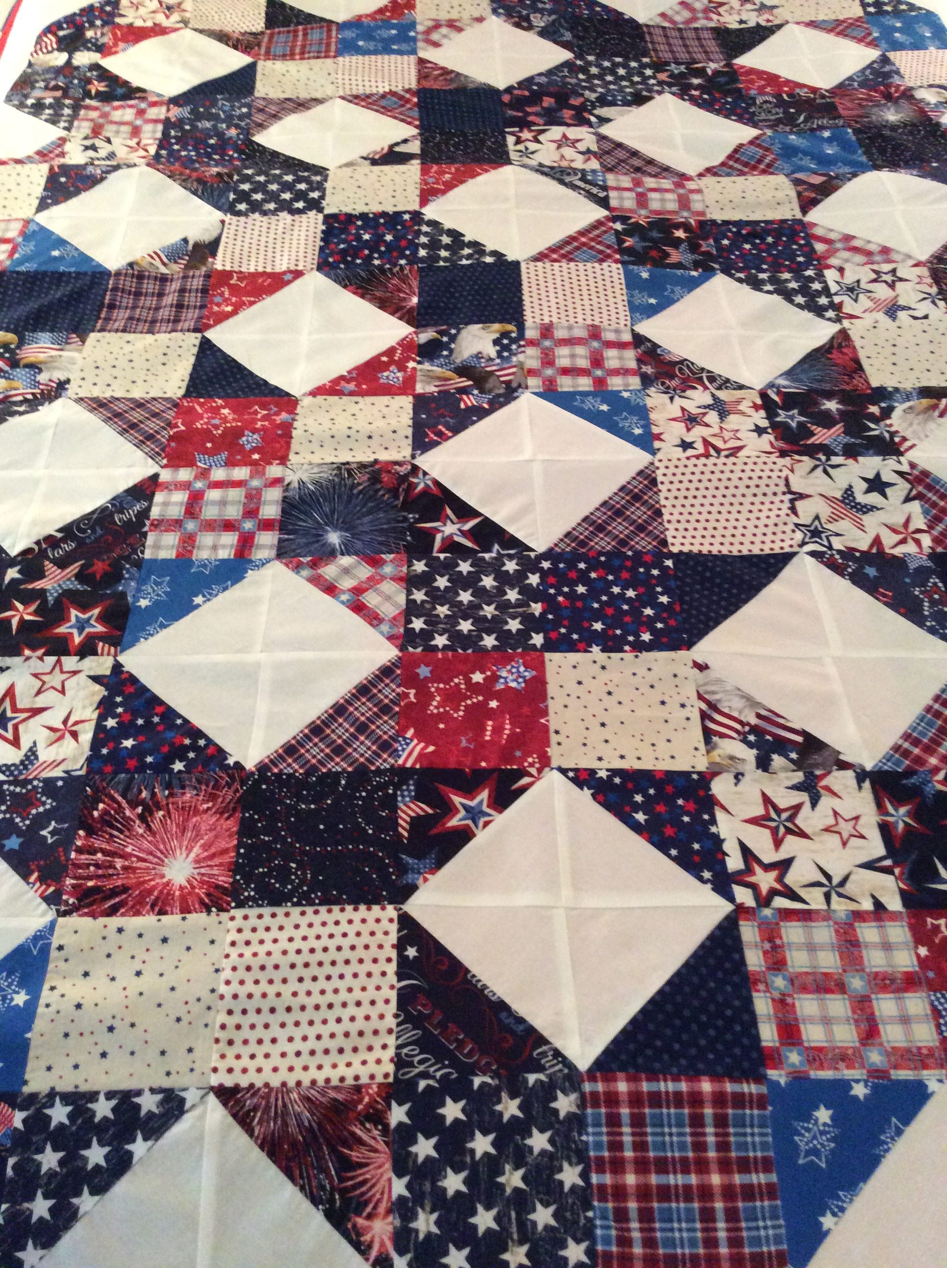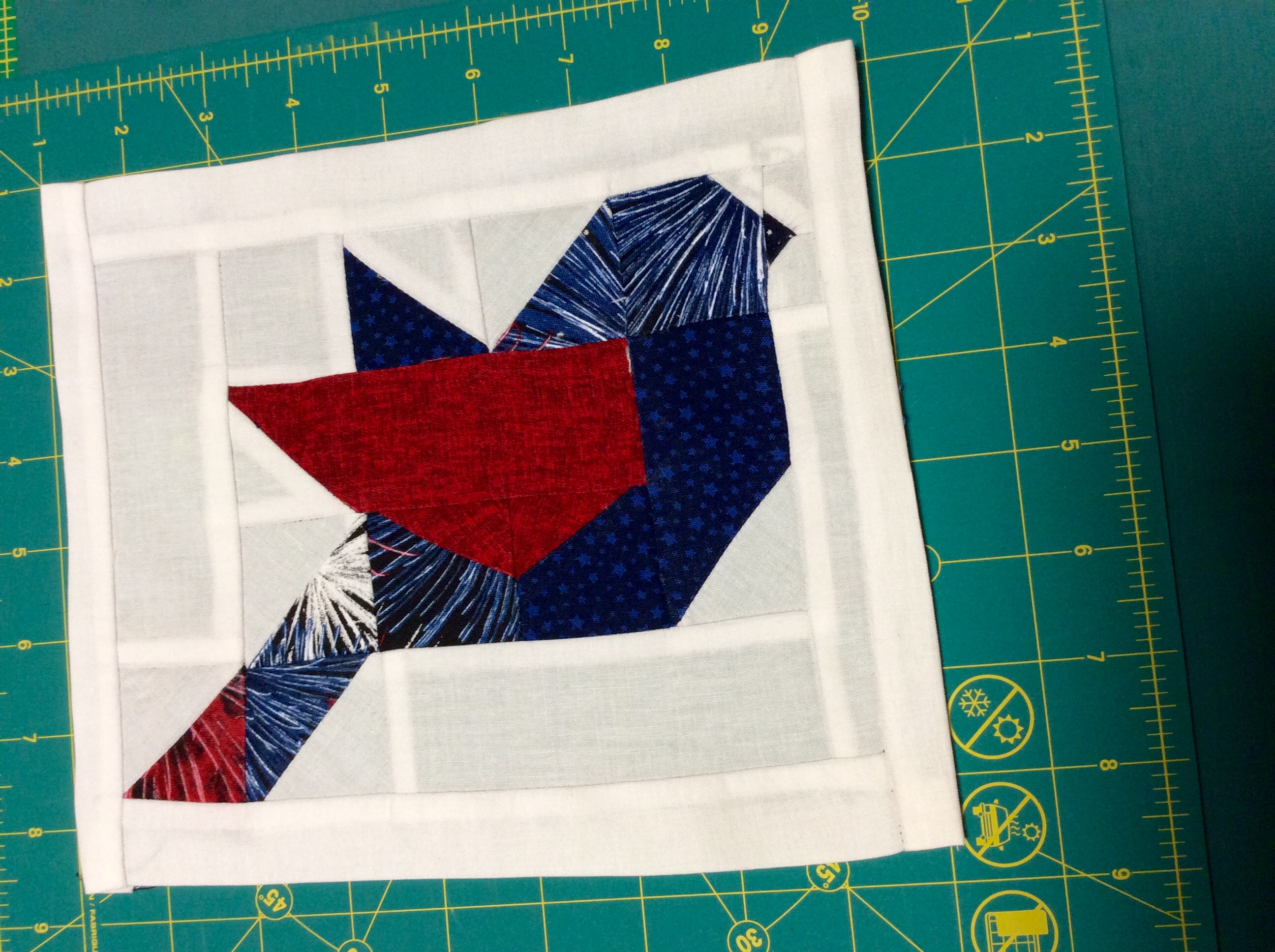 My Bernina Sport was a gift from my husband 35 years ago. It is an old and good friend. Together, we have made dozens of flannel baby quilts over the years. They are made like a pillow case and tied…that was my only quilting skill until I retired in June 2015. In the past two years, I have been able to take quilting lessons and I am about to finish my third pieced quilt. I call these pieced quilts hugs and every part of the process feeds my soul. The pieced bird is made from scraps of the red, white and blue quilt and will become the label for my oldest grandson’s quilt.