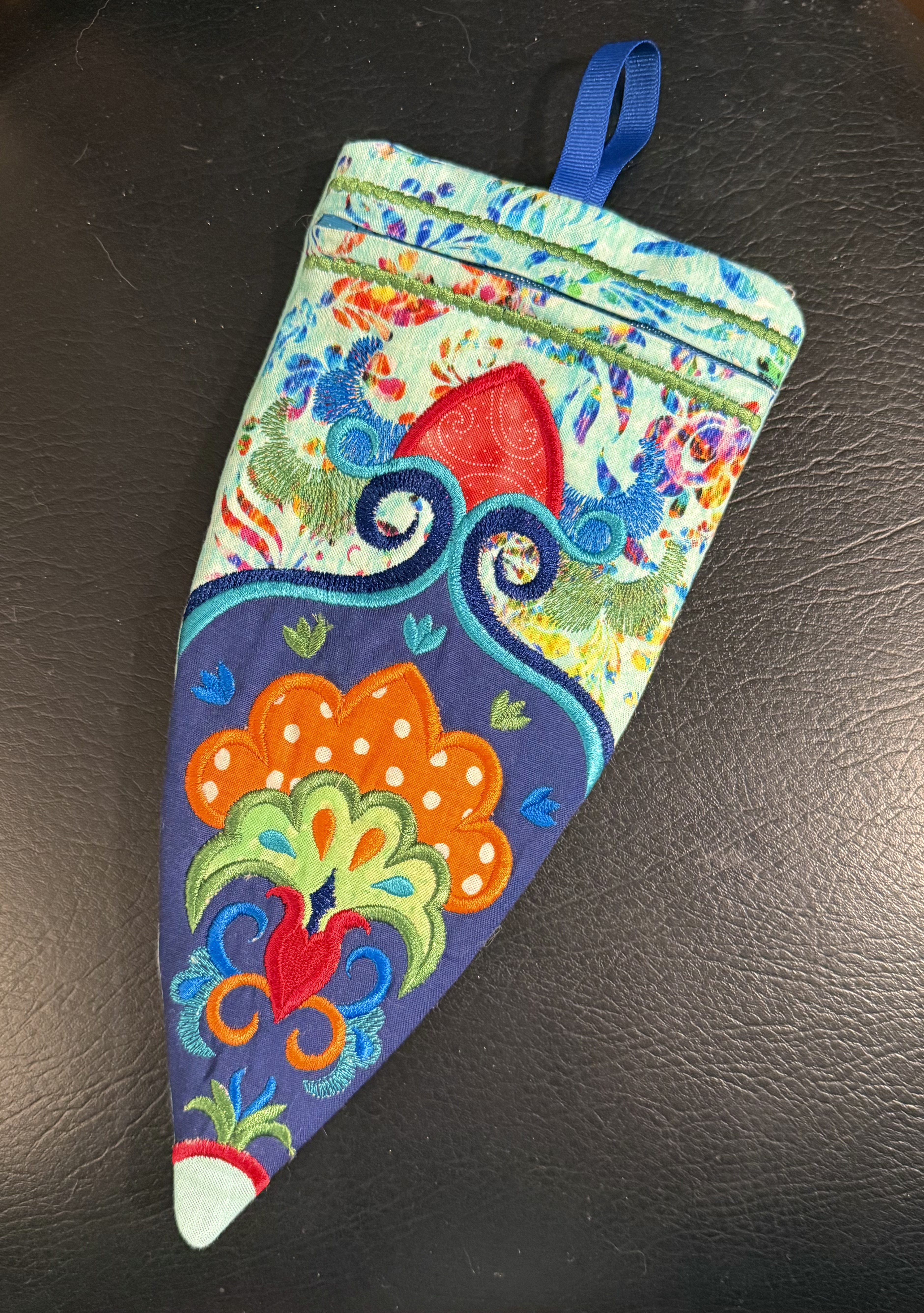 My first embroidery project on my 990, and my first “in the hoop” project – ever! Scissors case by Sweet Pea Designs.