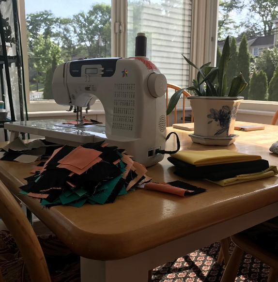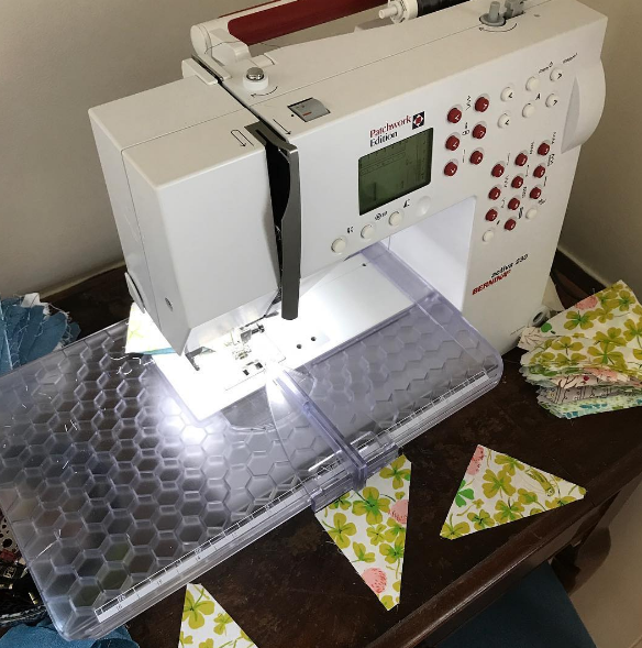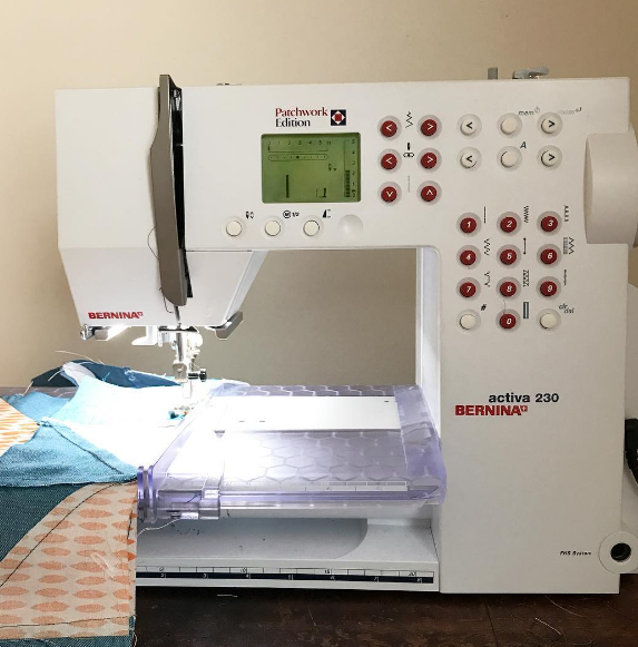 My home is small and I do not have a dedicated sewing room. I used to have an entry level Brother machine, that I would move around to wherever the best light was in our home. During the spring and fall it was set up in our sun room and during the summer and winter you were likely to find me in the basement. Here is a little secret, I hate working in the basement. Even though it is finished, I’d much rather have a small table in my dining room than a large one in the basement. Recently, I upgraded to a used Bernina (230PE). I love her so much, she’s smooth and strong! She lives in my dining room on an antique sewing table. I do most of my cutting in the basement still but the main show happens in the heart of the house! It’s also had the added benefit of me squeezing in more sewing, with two small children (one who is just 8 months) 10 min here and there is a blessing!