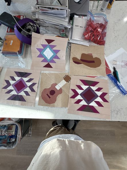 First foundation paper piecing quilt for me. There is definitely a learning curve. My guitar block came out 11.5×11.5 not 12×12! I have no idea what I did wrong. I printed the pattern from two different downloads. On then top of piece D was cut off so I re-downloaded the pattern. My inch test square matched up but I ended up 1/2” small 🤦🏻♀️