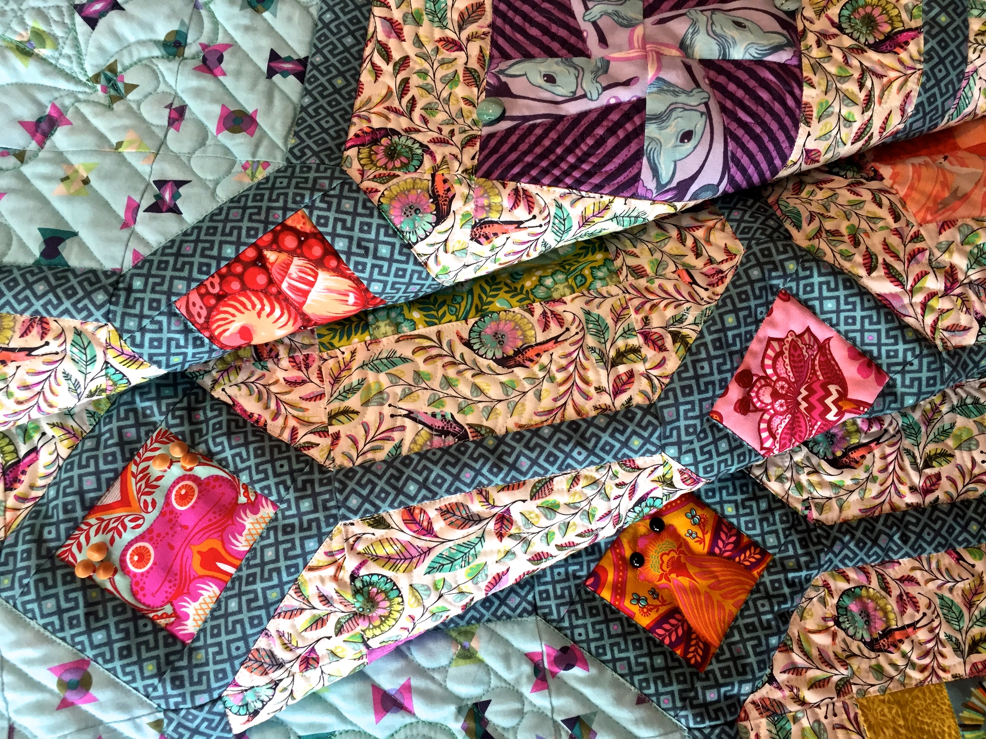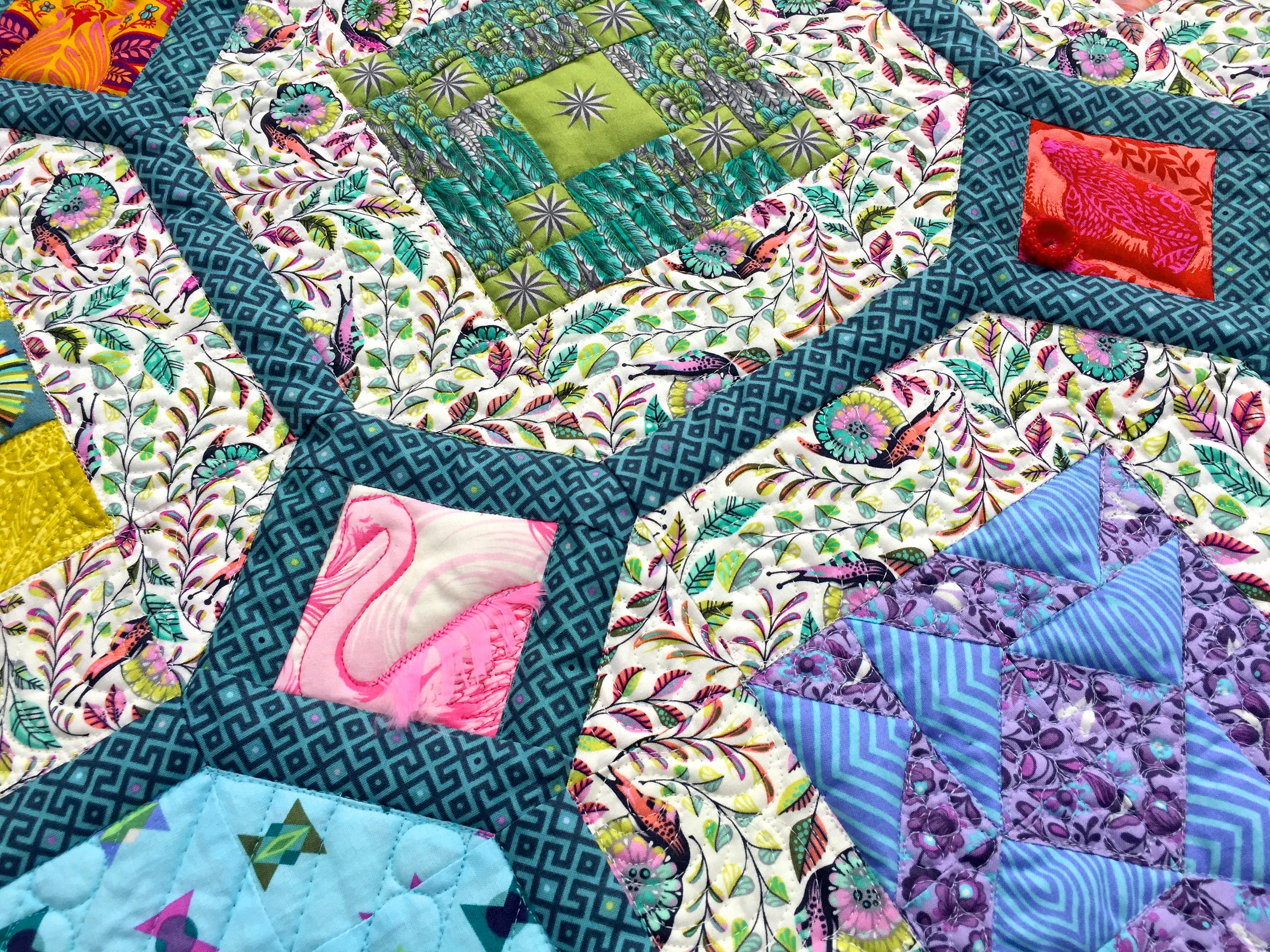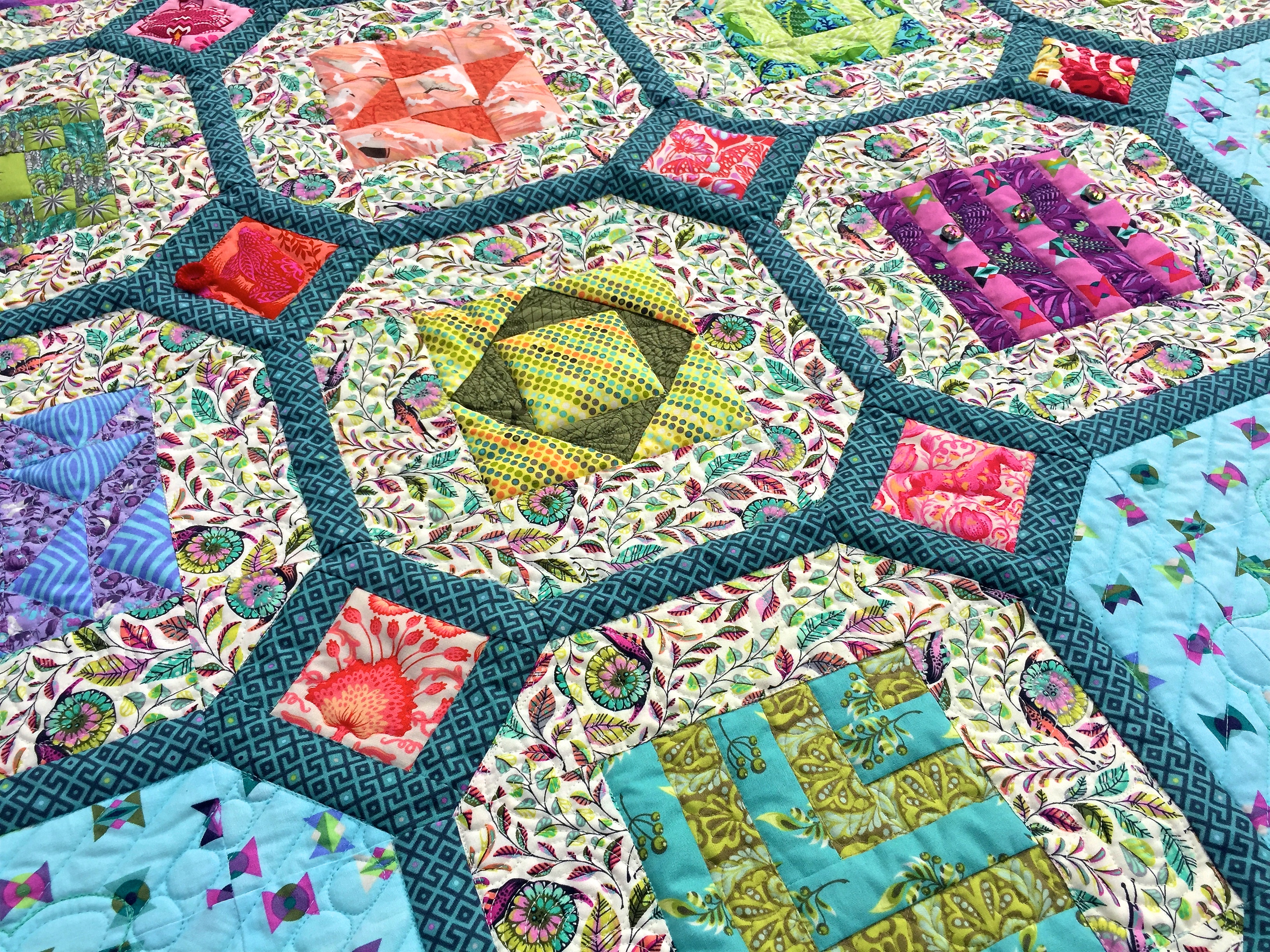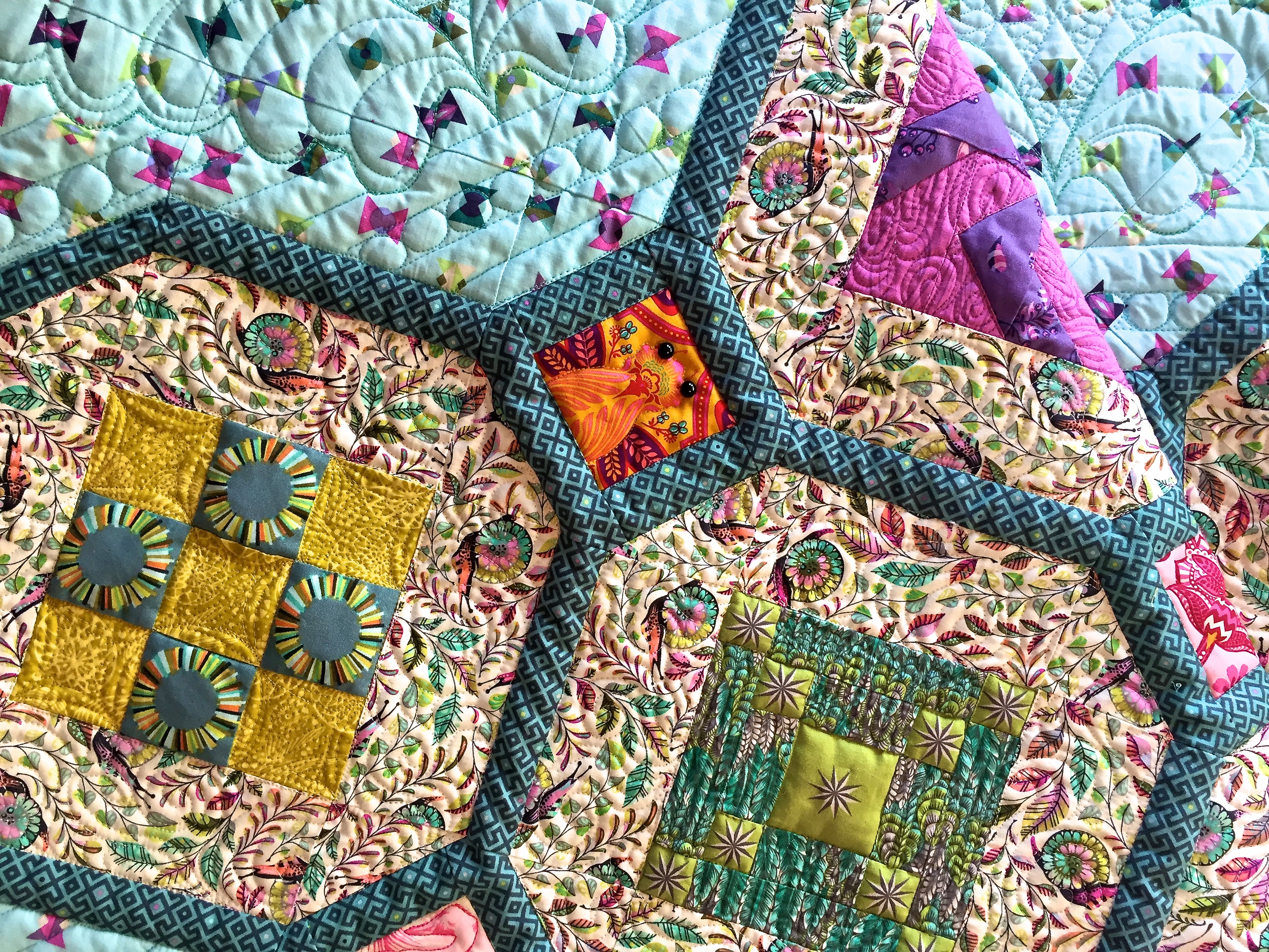 The Bernina 125th Anniversary Quilt Along was in full swing this March. I’d like to share my Vibrant Celebration Quilt as part of the Nationwide Celebration of Quilting Day. Amanda Murphy shared wonderful blog post tutorials and videos outlining the entire process. It was a fantastic opportunity to learn about everything from choosing fabrics to pinning for precision, to couching threads, to piped binding. Regardless of skill level and available resources, there was something for everyone to learn and enjoy. Taking part in the quilt along encompassed the spirit of National Quilting Day, as I got to know others spread far around the globe, who share my passion, as I detailed my process on the We All Sew Community section and socialized through the comment feeds. I am thankful for all Bernina does to promote quilting and build community.