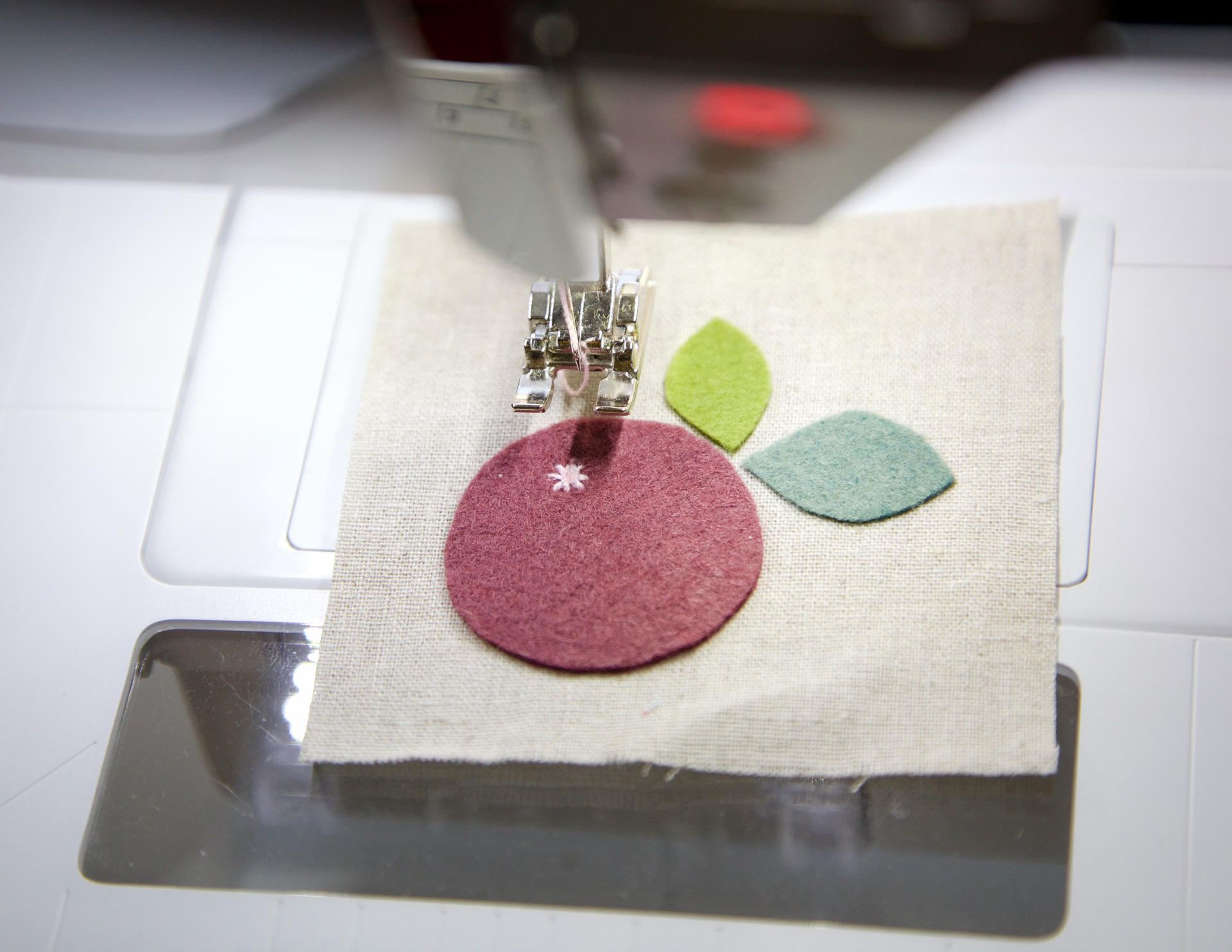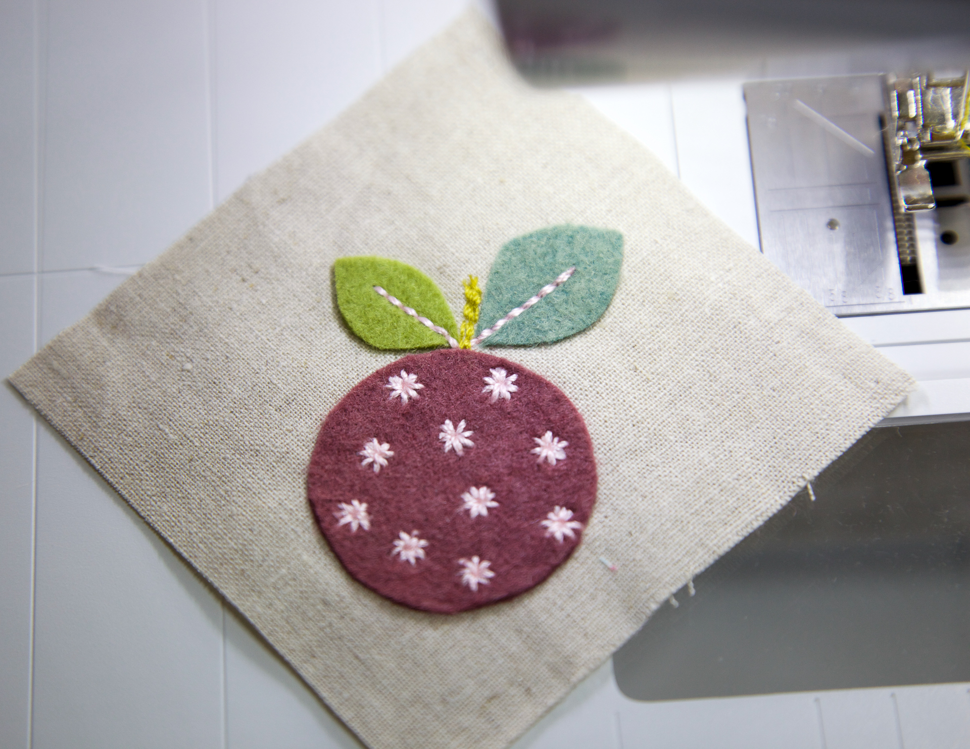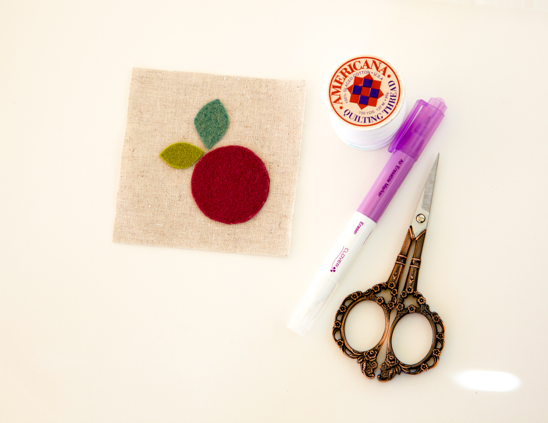1.Trace a 1  1/2” circle on purple felt using a spool. Attach 2” square of fusible web on the back of felt. Lightly press and cut out the shape. Draw two leaf shape on different green felts using fabric pen and follow the same steps. Following the manufacturer’s instruction, fuse the cut out design on 3 1/2” square linen.