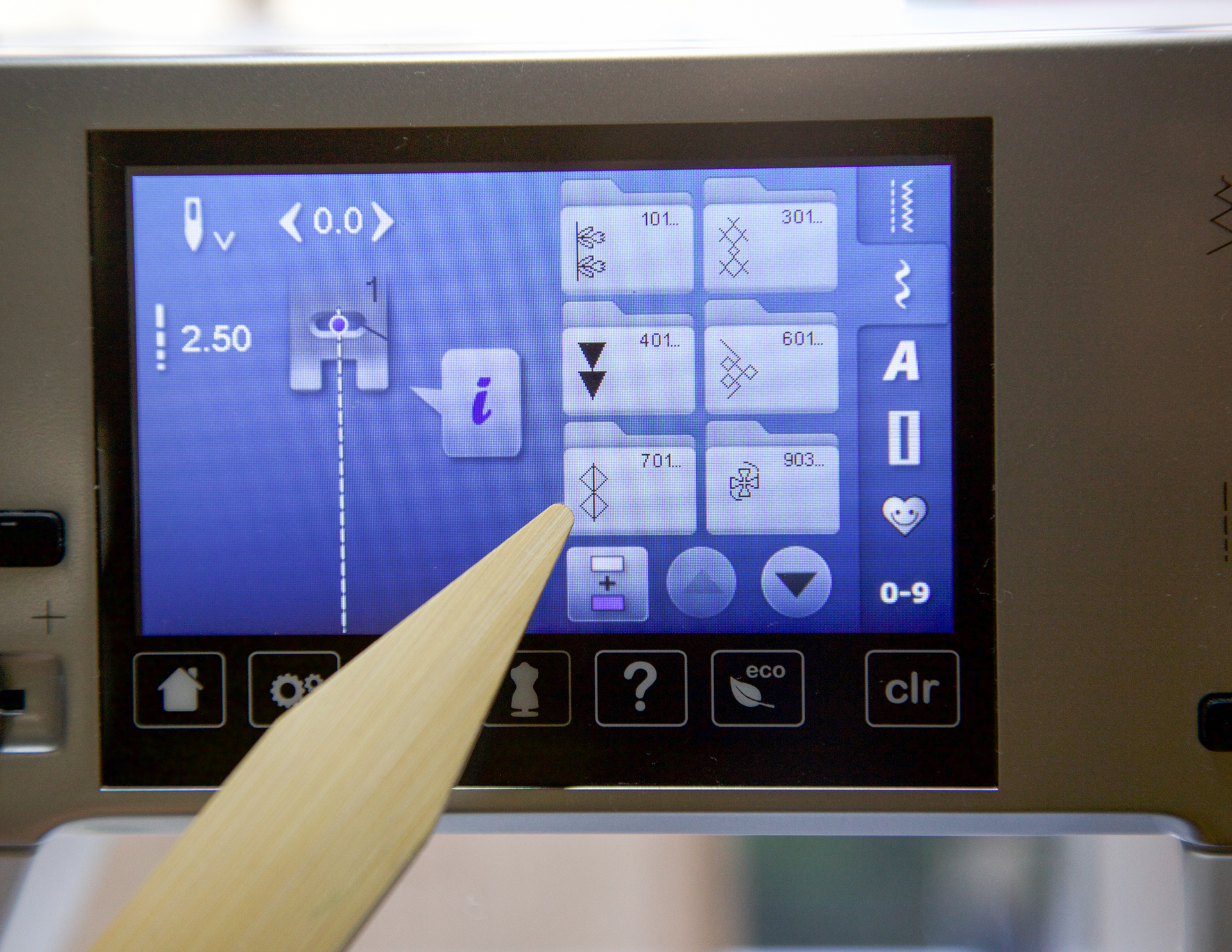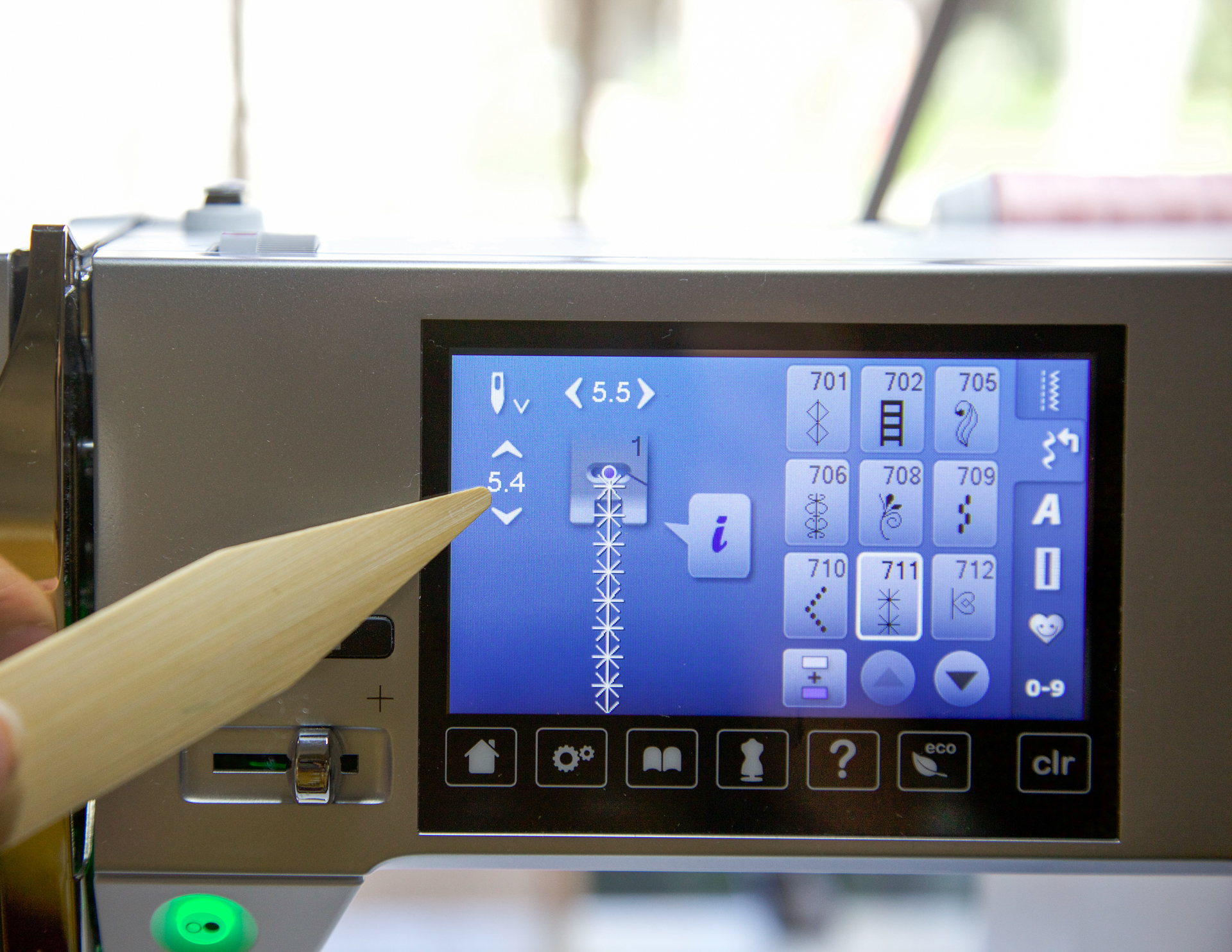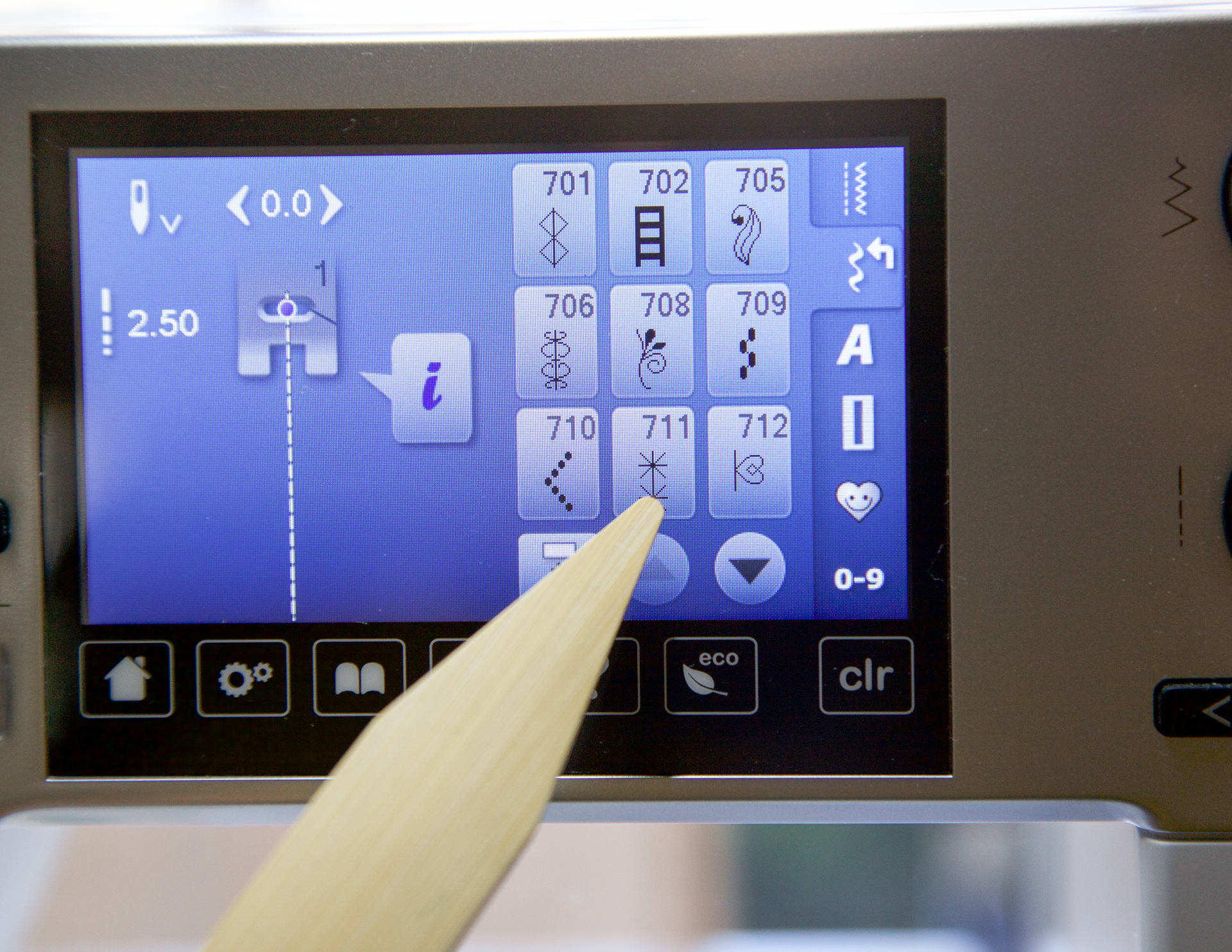 2.Set up your machine to sew. Use a size 90 needle,  12 wt cotton thread, and Open embroidery foot #20/#20C/#20D. I selected a decorative stitch that reminds me of a flower, it is stitch #711 in my B 570 QE. I increased the stitch width just a bit. Feel free to select any stitch you like, and try a test on a scrap of fabric to see if you like it.