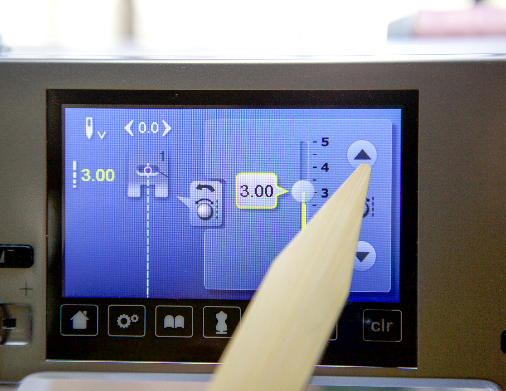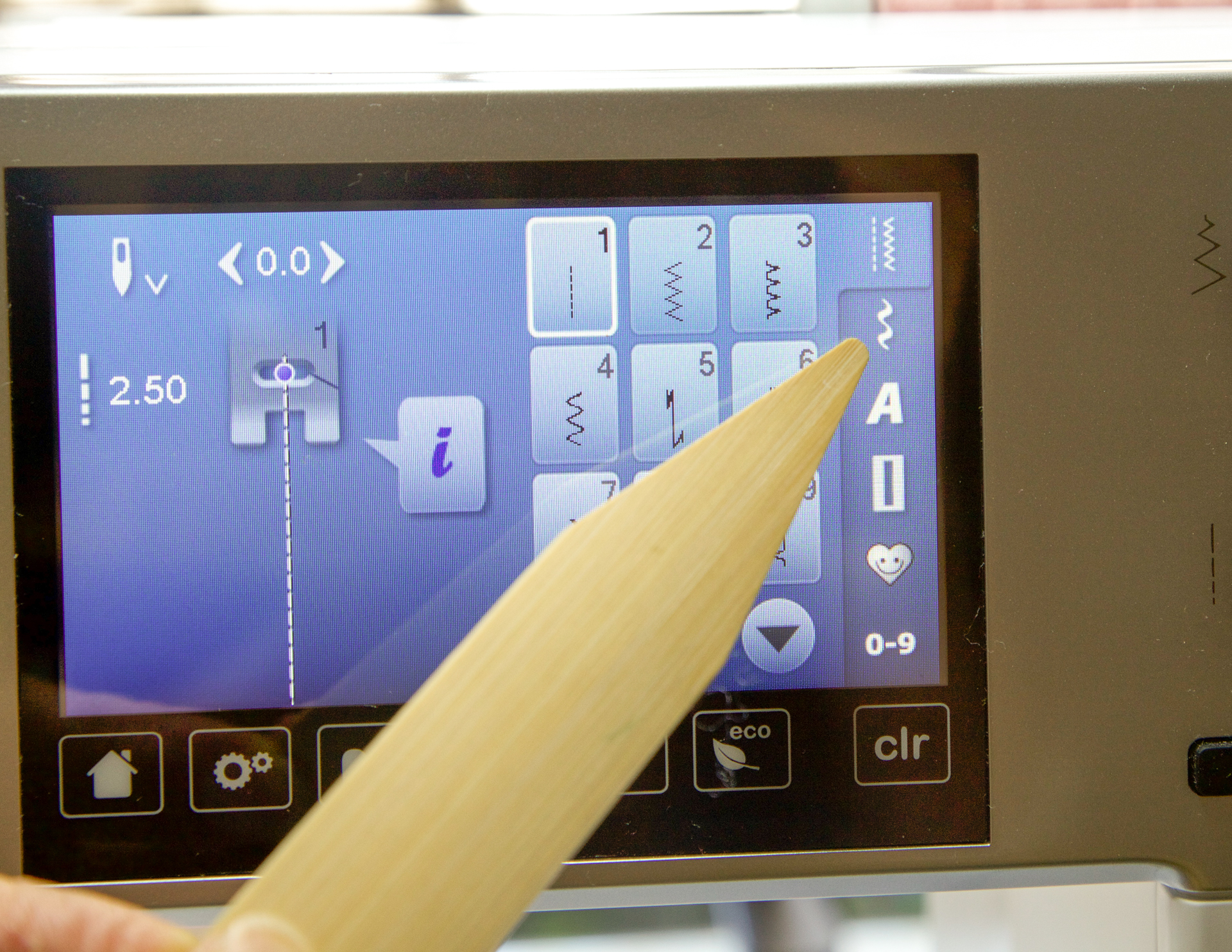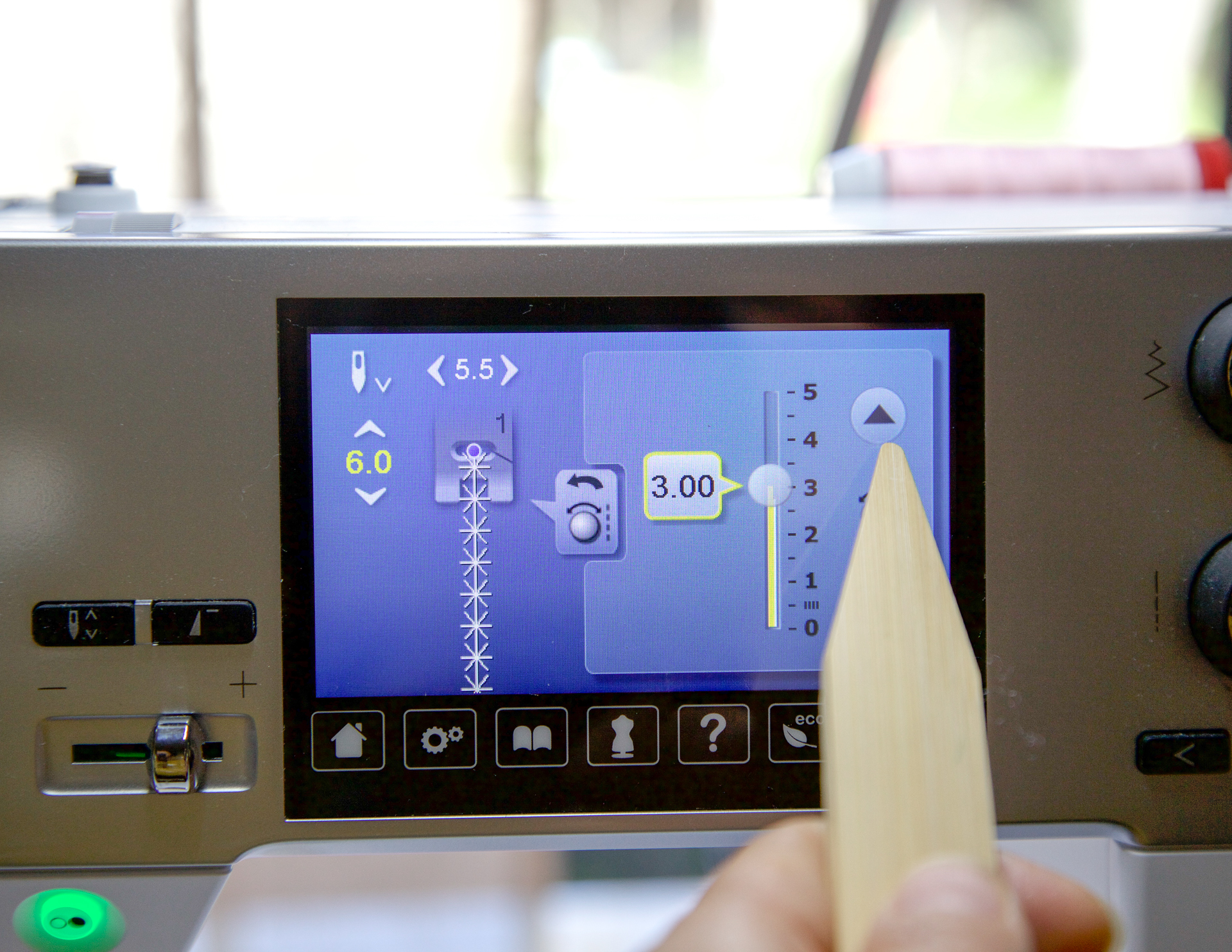 2.Set up your machine to sew. Use a size 90 needle,  12 wt cotton thread, and Open embroidery foot #20/#20C/#20D. I selected a decorative stitch that reminds me of a flower, it is stitch #711 in my B 570 QE. I increased the stitch width just a bit. Feel free to select any stitch you like, and try a test on a scrap of fabric to see if you like it.