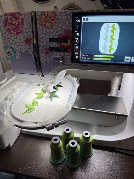 To capitalize on the hooping and on the fact that I would need MANY leaves, I doubled the embroidery by adding a layer. To do this, you will press your + button on the screen and this will allow you to add multiple designs to your hoop image – think of it as layering in photoshop or illustrator–you do just need to reposition and resize the design to make sure each have their own space to be embroidered out and you can do that by pressing the i button. I made two layers, so I had the embroidery doubled in parallel lines, and I reflected one so I could make them as big as possible in my hoop. Once I had the positioning done, I went ahead and threaded my machine and got started by hitting the green go button!