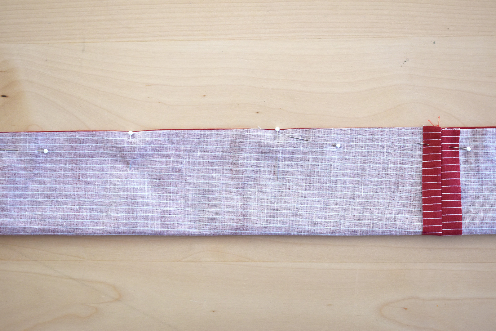 Fold the strip over lengthwise and pin together, leaving an opening about 4″ wide to the side of the seam (for turning the ties inside-out in a later step).