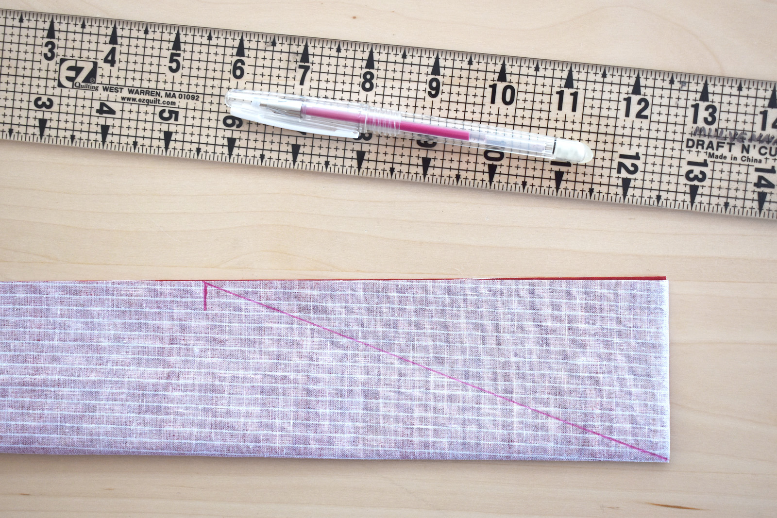 At each end of the ties, use a ruler and fabric safe pen to mark 7″ away from the short end along the raw edge. Then draw a line from the folded corner end to the 7″ mark as in the photo above.