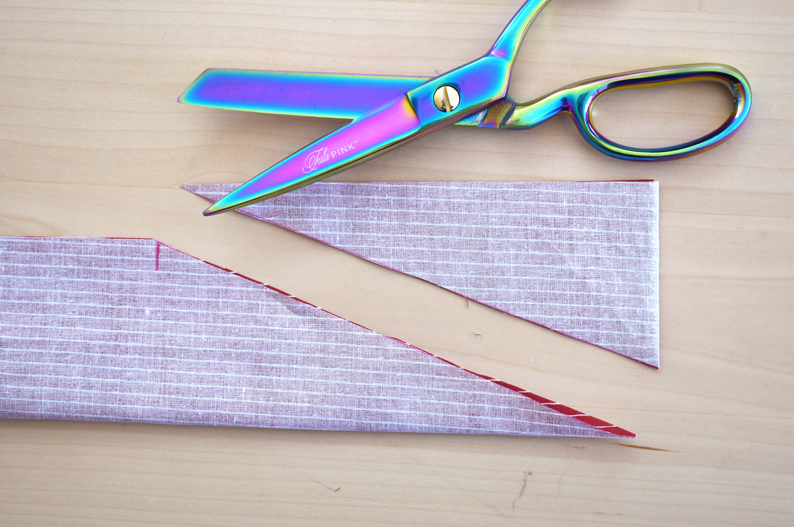Starting with one handle, fold the strip in half lengthwise and pin along the long edge leaving one end open. At the other end, follow the steps above to measure and cut the end into a point. Stitch along the pinned edge with a 1/2″ seam. Snip the point off close to stitching and turn the handle right side out through the end opening.