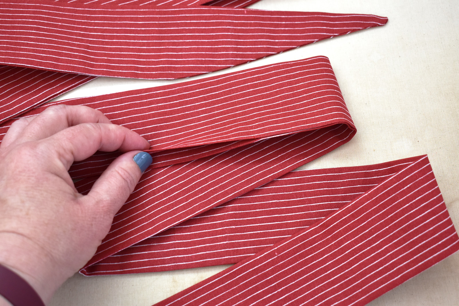 Use the remaining four 5.5″ x WOF strips to create the handles. Cut the selvage edge from one end of the strips, then cut the strips to 37″ long. For each strip, follow these steps.