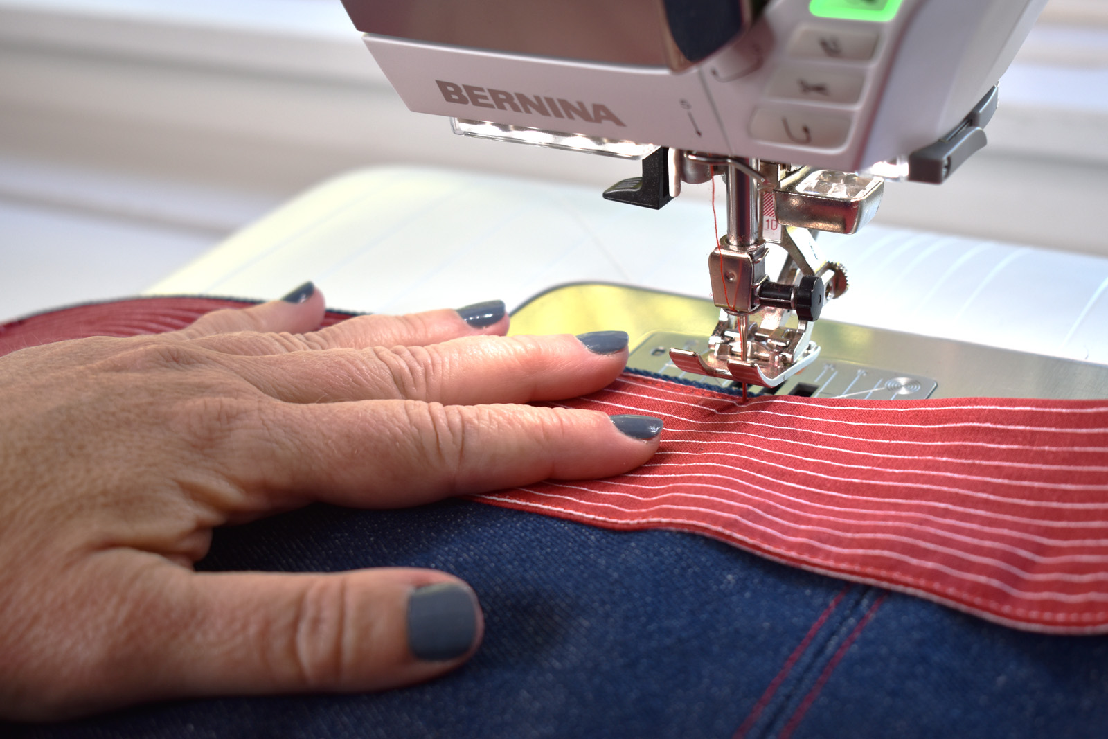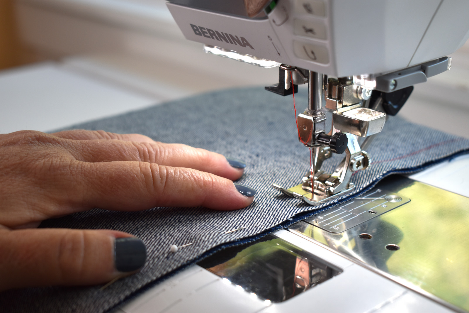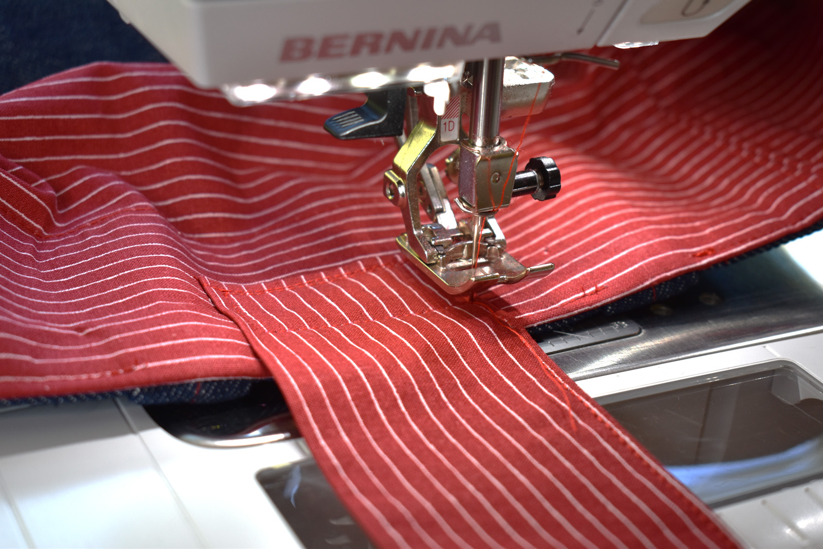 Use the BERNINA Height Compensation Tool to help keep the presser foot level through the process of stitching the thick folded over loop end to the outside of the bag. Press the bottom of each loop under 1/2″ and pin in place, placing the pin in the middle of the loop to hold it steady as you sew the end in place.