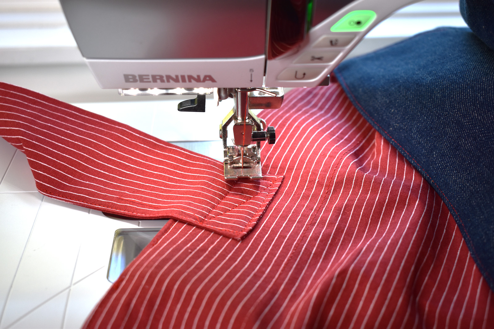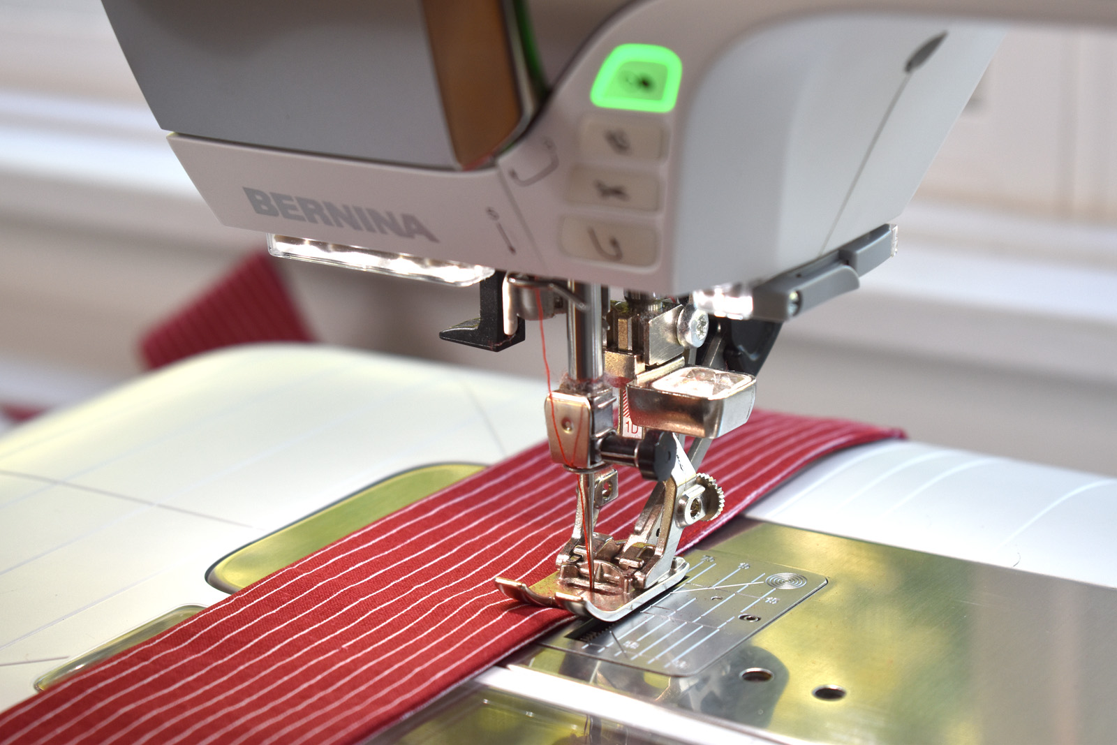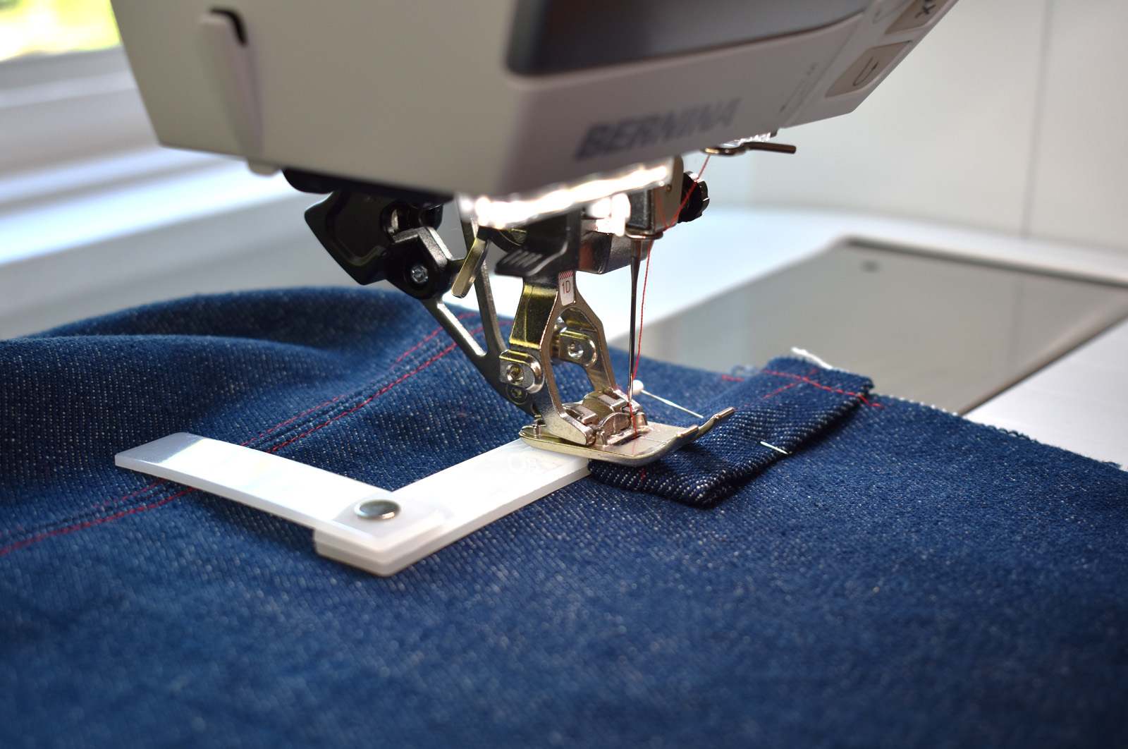 Use the BERNINA Height Compensation Tool to help keep the presser foot level through the process of stitching the thick folded over loop end to the outside of the bag. Press the bottom of each loop under 1/2″ and pin in place, placing the pin in the middle of the loop to hold it steady as you sew the end in place.