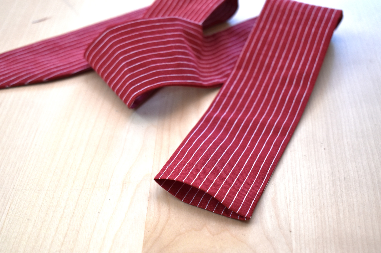 Stitch on the seam edge of the tie, from one point to the other, closing the opening in the process. Set the ties aside.