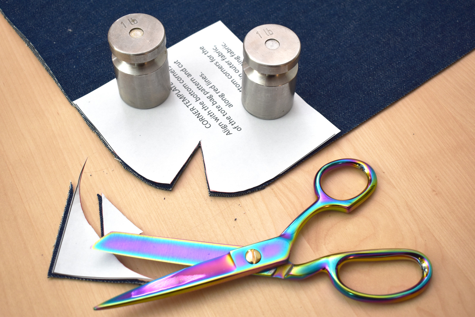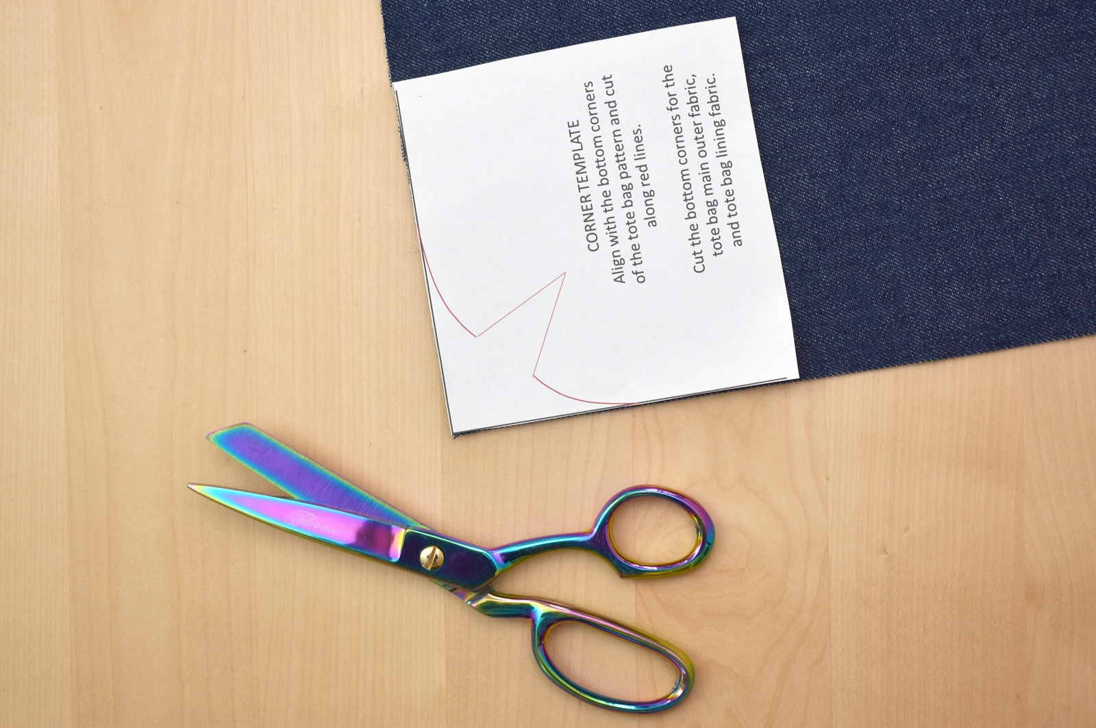 Cut the bottom corner sections of the main outer tote bag. Using the printed template, cut along the black lines to the corner, and cut close to the wording as in the photo below.