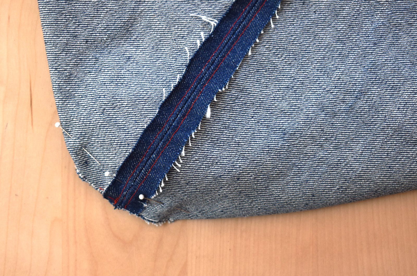 Next, fold the bag right sides together and pin down both sides from the top edge to the notch with a 1/2″ seam. Press seams open.