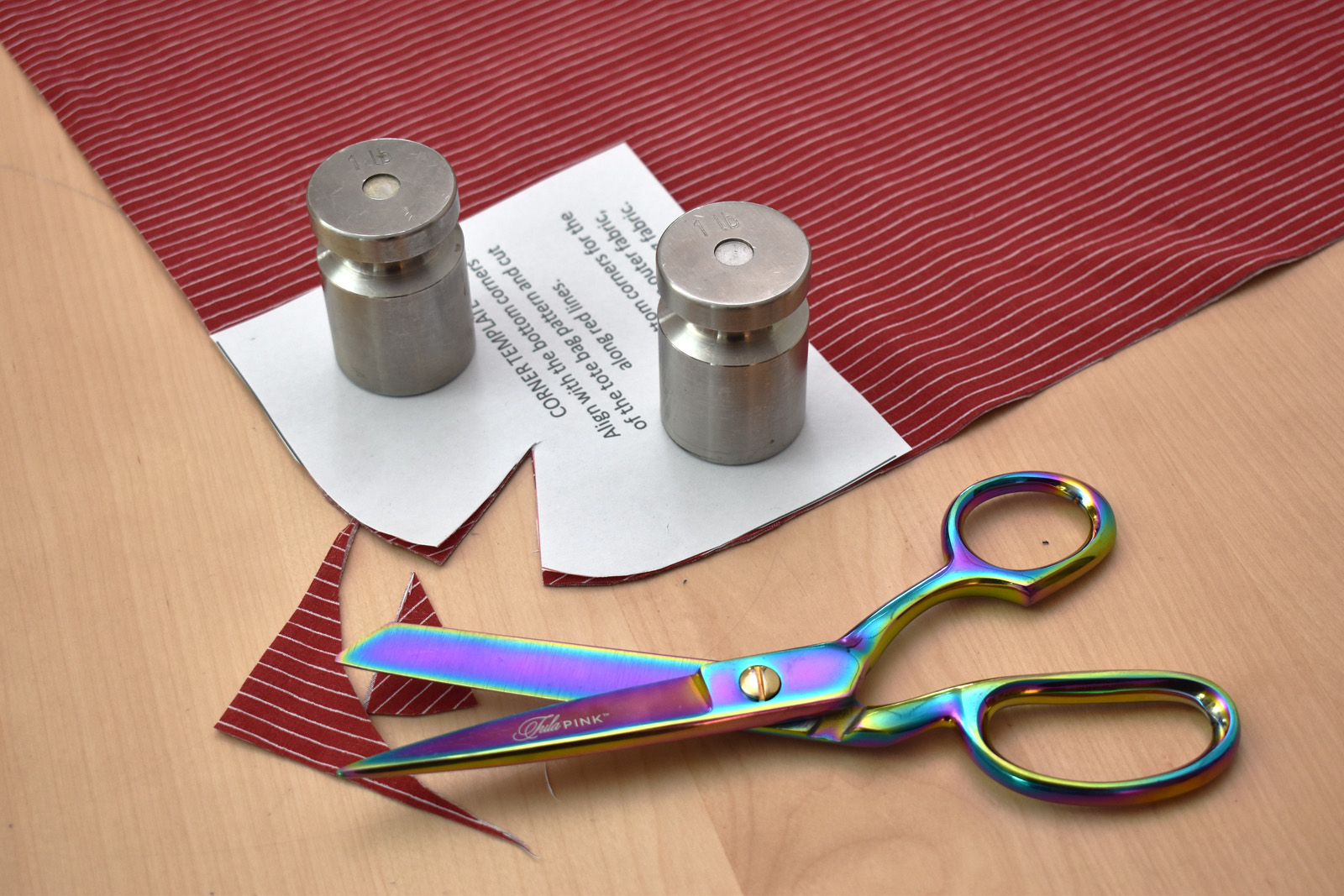Use pattern weights or pin the template in place and cut along the red lines. You may find it easiest to cut the curved line first, then go back to cut the “V” notch. Repeat with the other bottom corner.