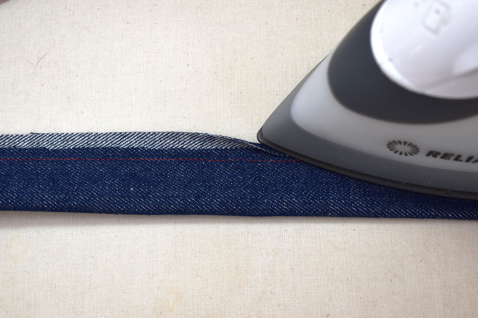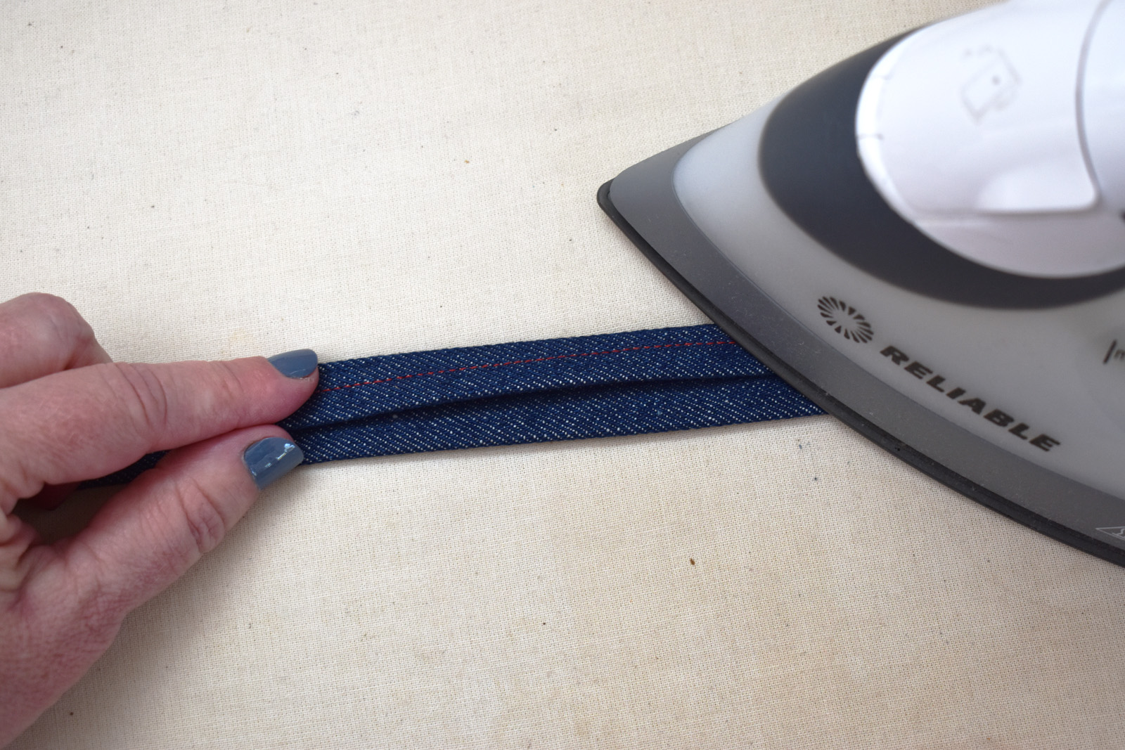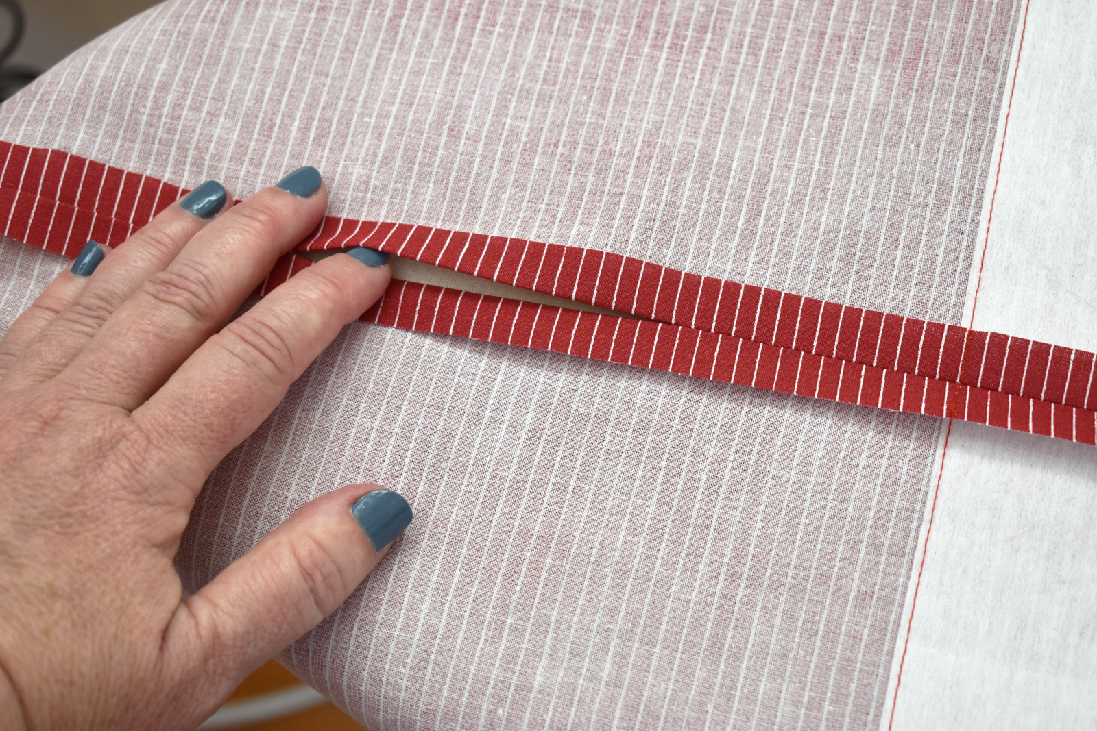 Work the long tube open with your fingers, roll the folded seam edge over encasing raw edge in the fold. Center the fold on the top of the tube and press well.
