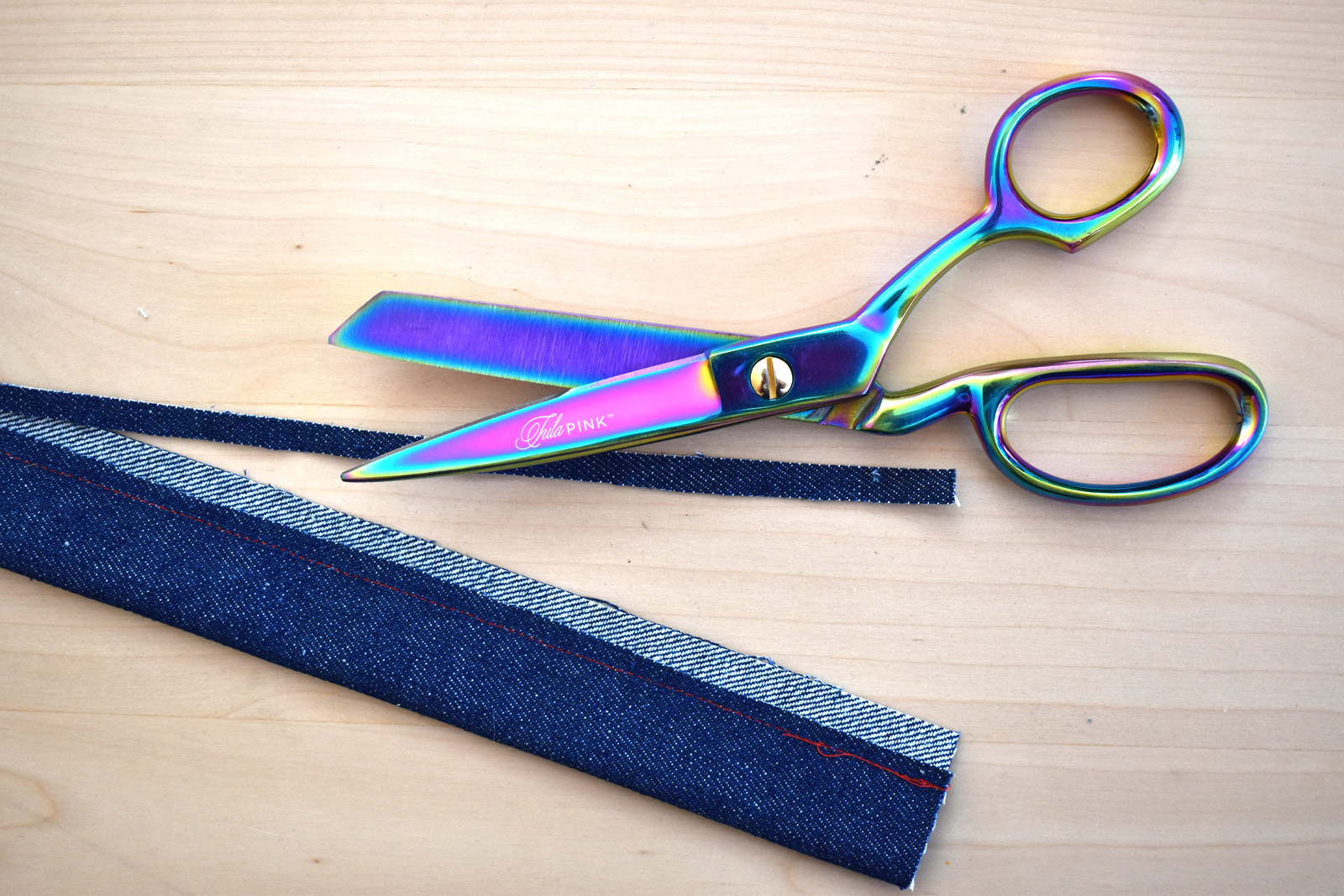 Fold the tie loop over lengthwise, wrong sides together (this means right side facing out) and sew a 1/2″ seam down the long edge. Trim only one side of the seam allowance close to the stitching.