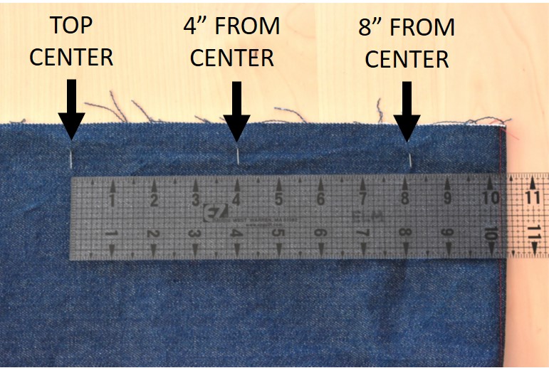 Pin the loops to the top outer edge of the main bag. On the main bag, mark the center of the top raw edge with a pin. Place a pin 4″ over from the center, and a pin 8″ over from center. Repeat marking the other top edge of the bag in the same way. Remove the center pin mark.