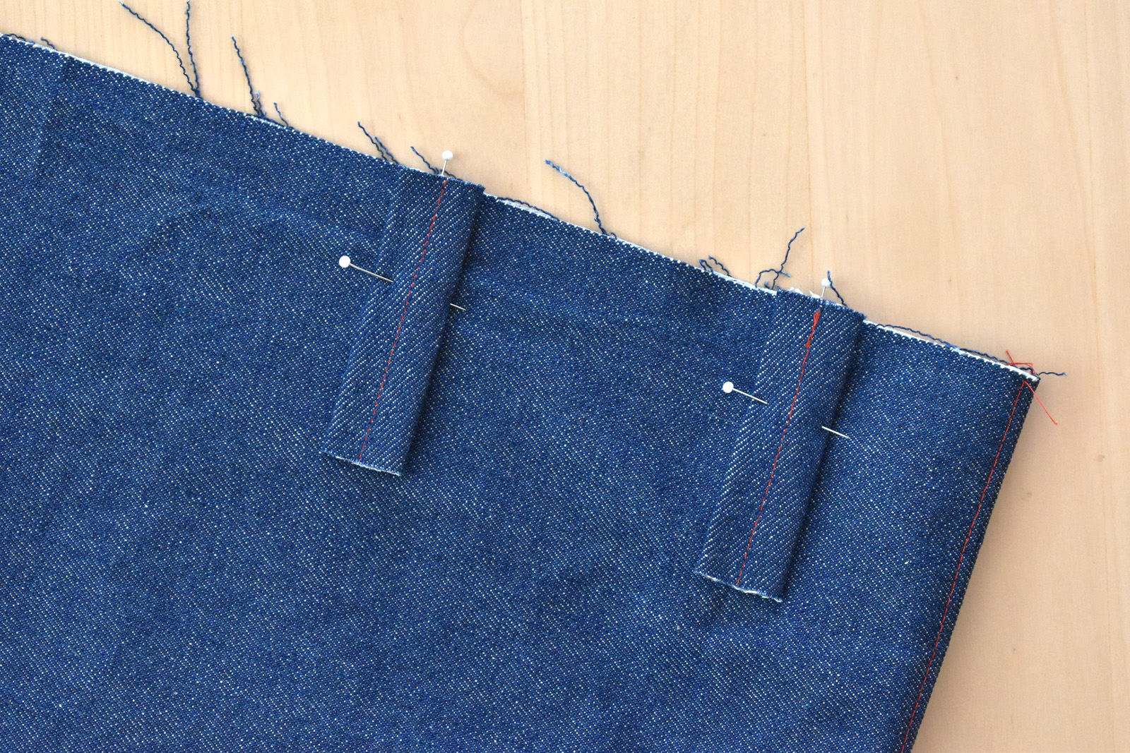 Center a loop over each pin, matching top of the loop with the top raw edge of the bag, and pin in place. Baste stitch each loop in place 1/4″ from the top edge of the bag to secure in place through next steps.