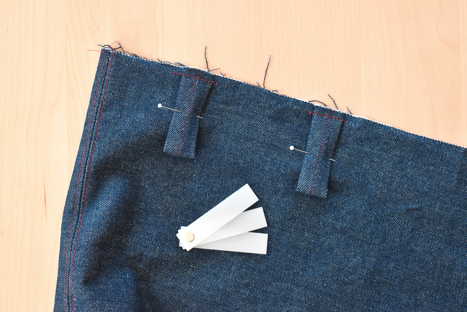Stitch a rectangular box shape on each loop (refer to the photo at the top of this section); the bottom stitch close to the folded edge and the top stitch about 1/4″ from the folded end. The Height Compensation Tool helps sew over thick and bulky seams. It keeps the presser foot horizontal to the feed dogs, which work best when the presser foot is horizontal. Place as many blades of the tool under the presser foot as needed to level out the foot. Give the loops a light pressing after stitching.