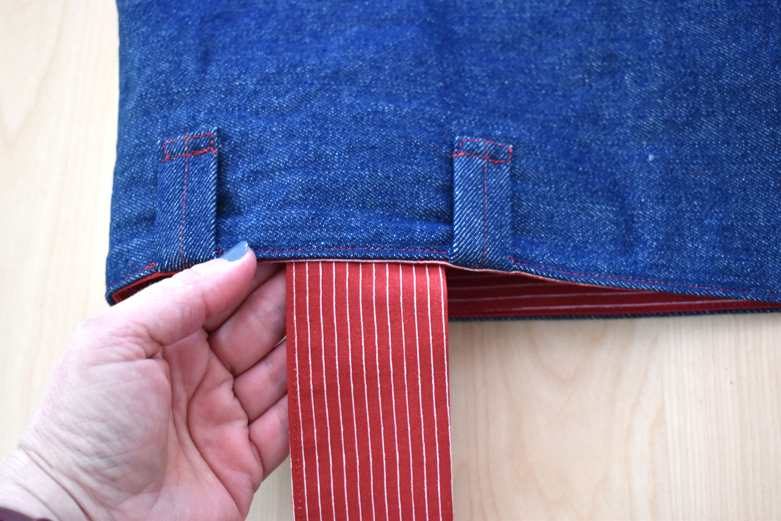 The tie loops are stitched to the top front of the bag and hold the waist ties in place when not in use. The top edge of the tie loops are stitched in the bag seam and the bottom edge is top-stitched to the outer bag.
