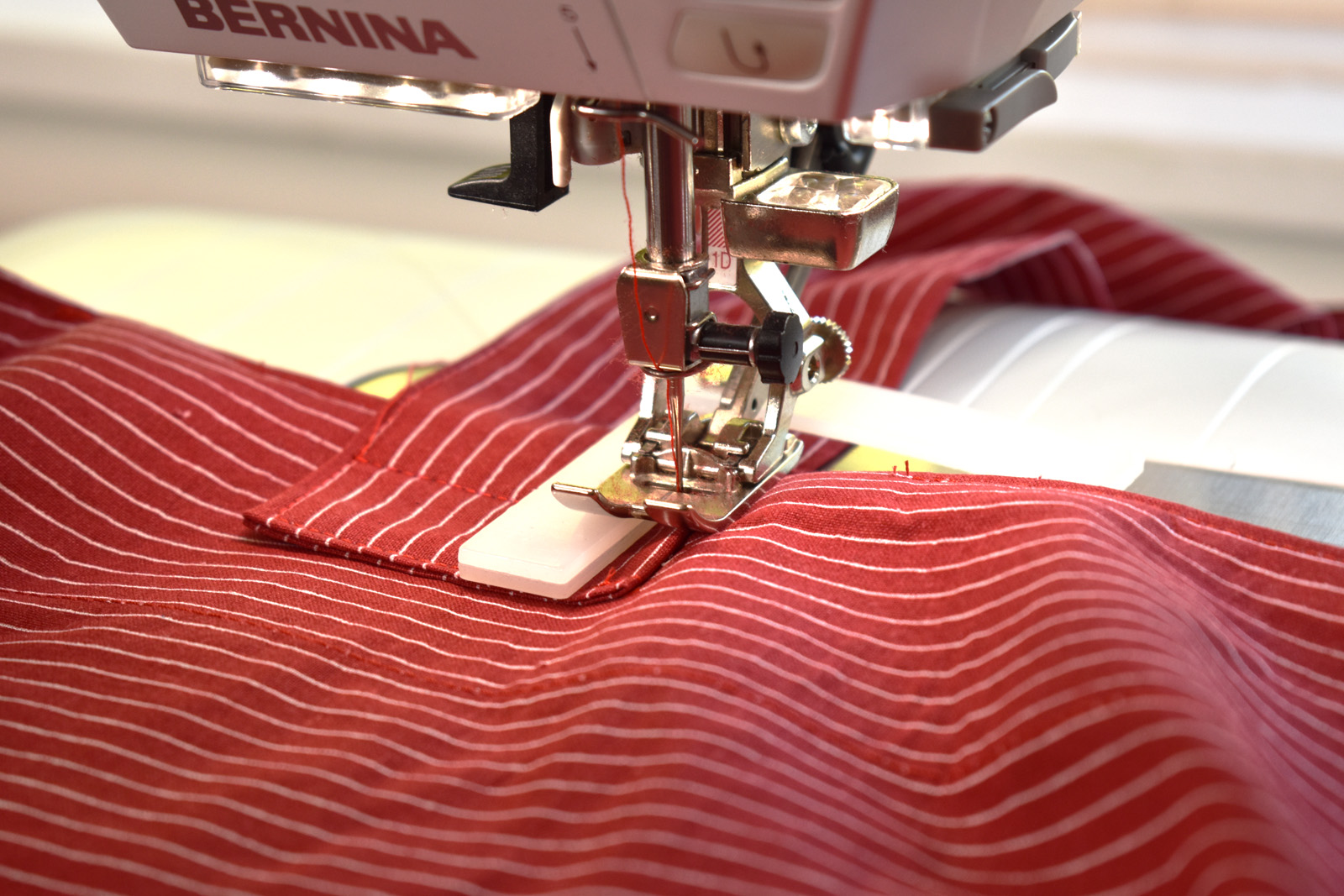 When sewing the strap close to the tie loop, use the Height Compensation Tool to keep the presser foot level and stitching straight.