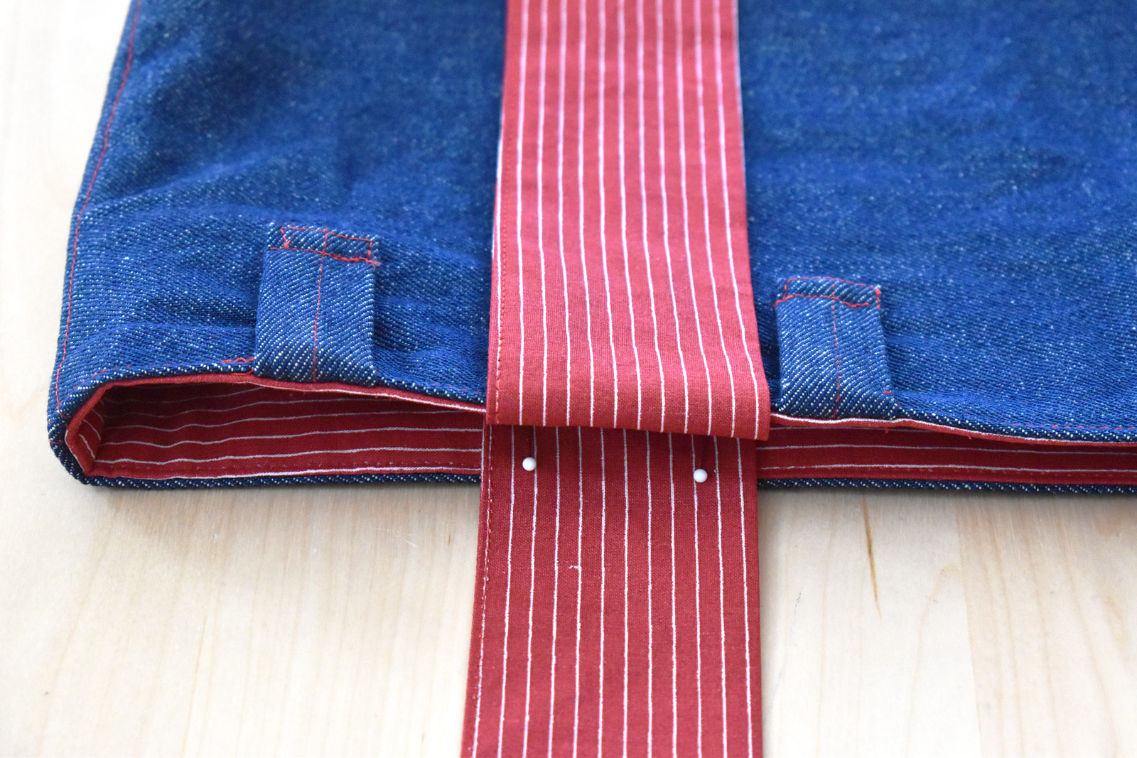 Continue to pin the tie to the top edge on the back of the bag, placing the last pin about 2″ away from the side seam. Repeat on other side.