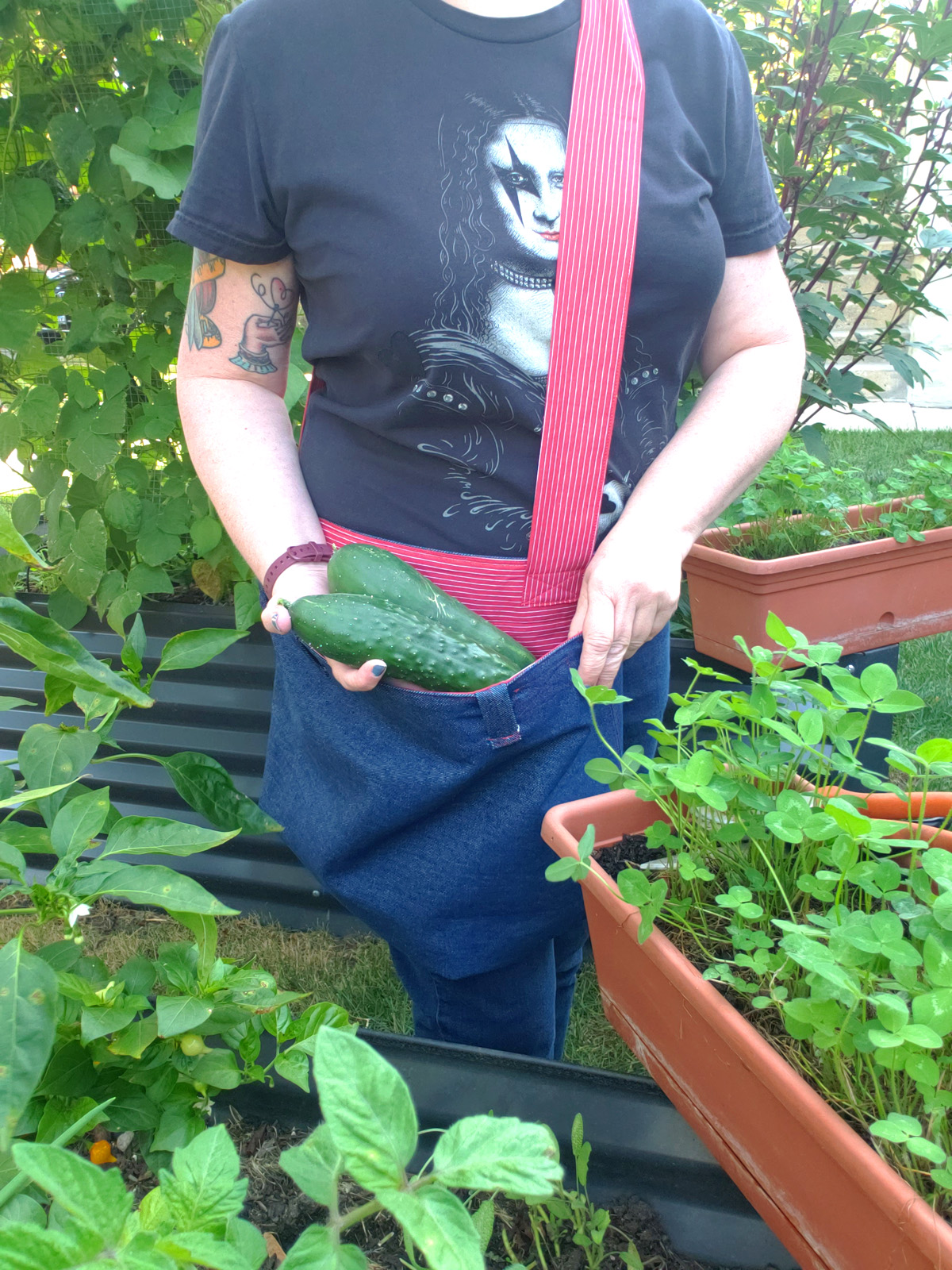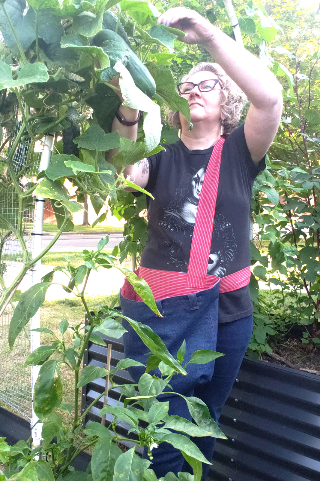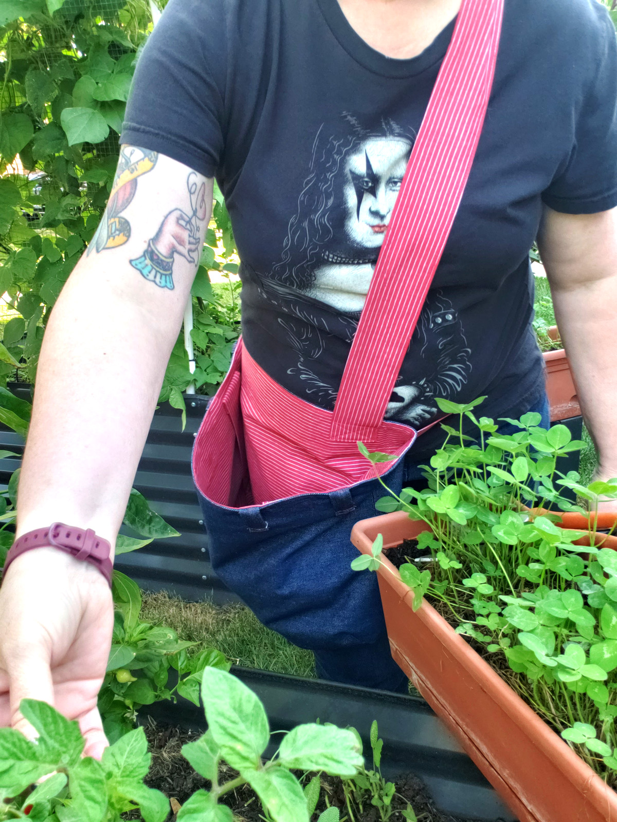 My vegetable garden was very fruitful this year,  and I needed a bag to help hold all the cucumbers, tomatoes, beans, cucumbers and other veg that was ripening every day. I found regular bags flopped around too much, baskets were too heavy on my arm, and pocket aprons just weren’t big enough. That’s how this Garden Harvest Apron Tote was created, wear it like a tote bag with apron straps to help keep your veg secured while working in the garden.