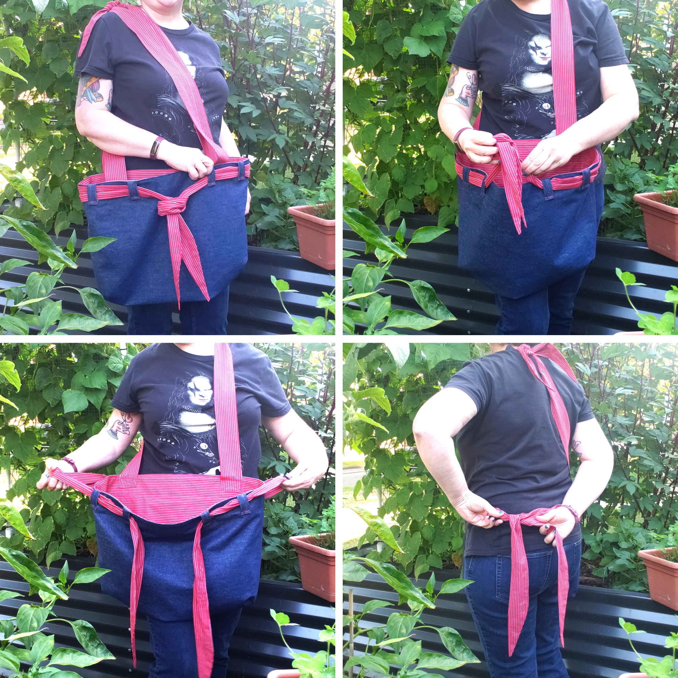 To use as an apron tote, wear over the shoulder or over your neck with the back handles, dropping the front handles into the tote. Undo the front knot in the ties and secure behind your back.