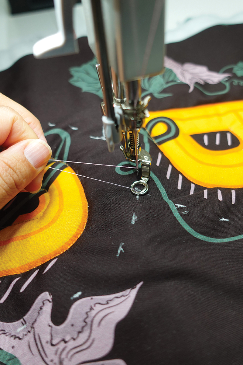 The AGF 13 Days of Halloween Panel includes two playful designs perfect for seasonal projects. For our door runner, we chose the right side of the panel and quilted it on the BERNINA Q 16. It’s a fast, fun project that’s perfect for getting familiar with the Q 16 and exploring your free-motion quilting rhythm.