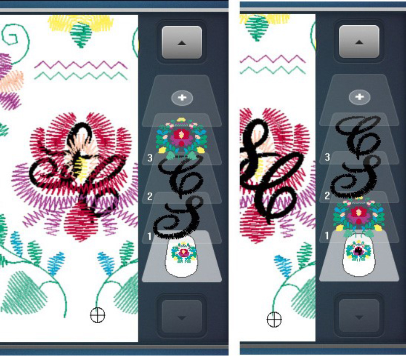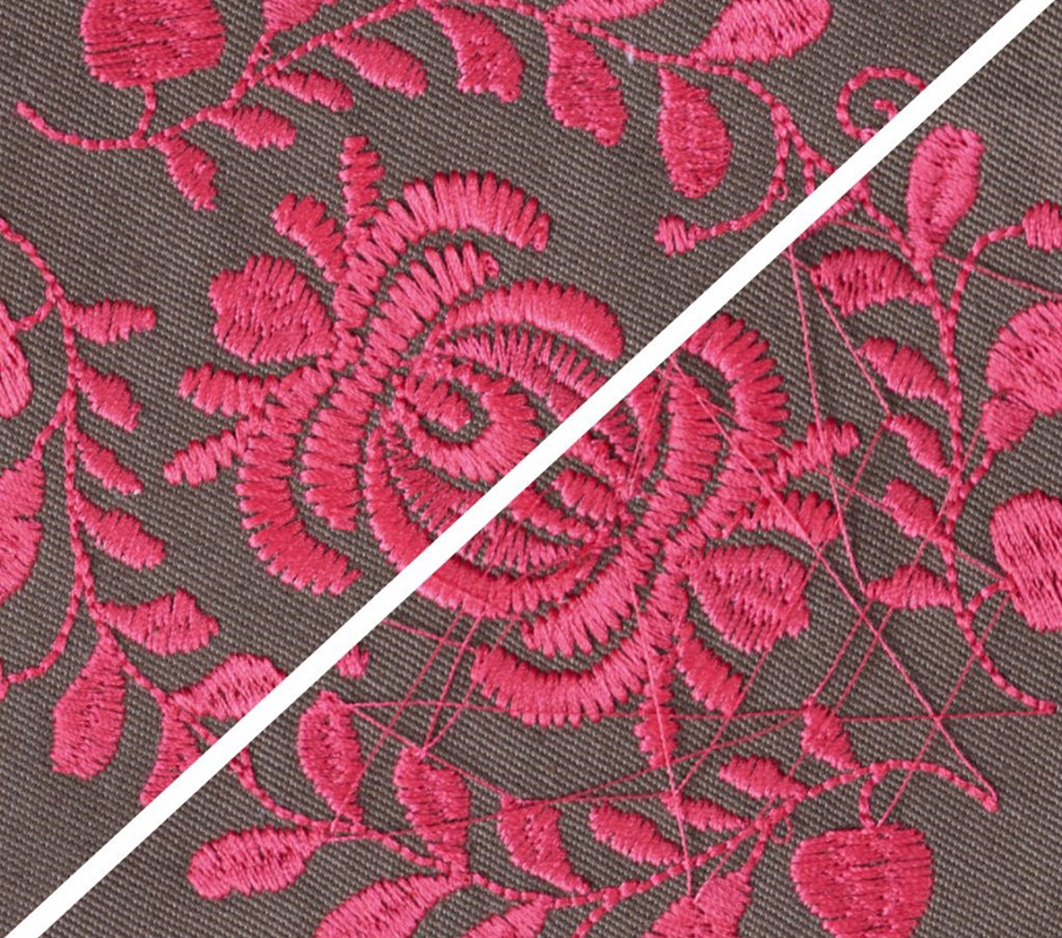 With the PLUS Upgrade, your machine will now pull the threads down to the underside for clean embroidery results on the top. You can even select the length of jump stitches that will trigger thread cuts. Note that the application of this feature varies according to the stitch properties of individual embroidery designs. The left side of the picture below shows what the embroidery looks like if Thread Away is activated. The right side show what it would look like without.