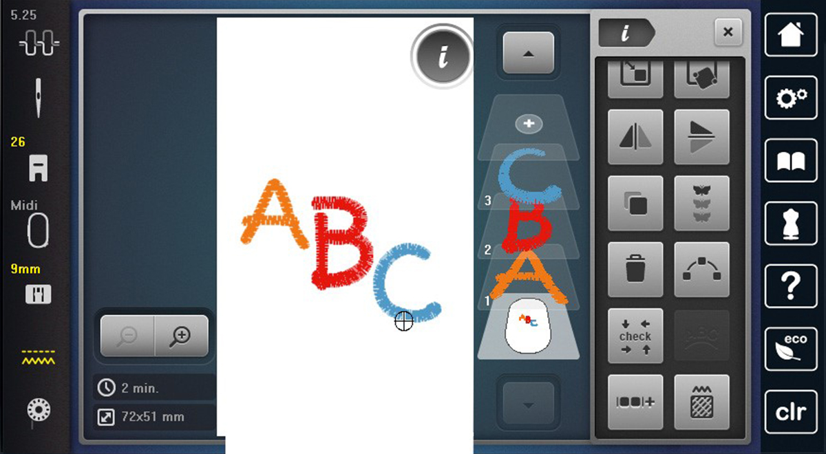When we combine designs on the screen, we don’t always add the elements in exactly the order we intend to stitch them out. Sometimes we add details at the end because they have to work with the rest of the design. When you need to rearrange the stitch-out sequence, simply rearrange the design layers. You can combine Rearrange with the Group function for quick re-sequencing of your design.