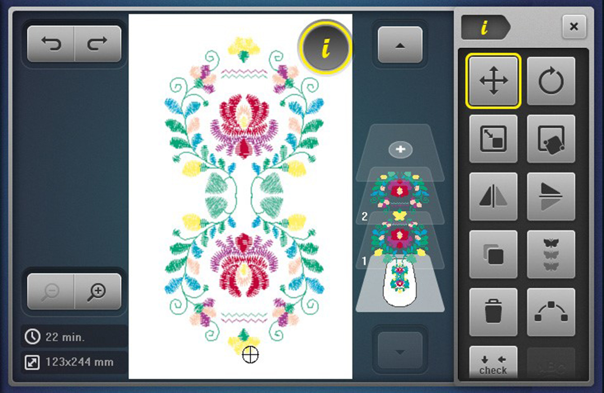 Undo is your friend! Have you ever touched the wrong button and ended up with an unwanted change? No problem: simply touch Undo and the booboo is fixed! You can also Redo steps while editing or combining designs to return to your previous position.