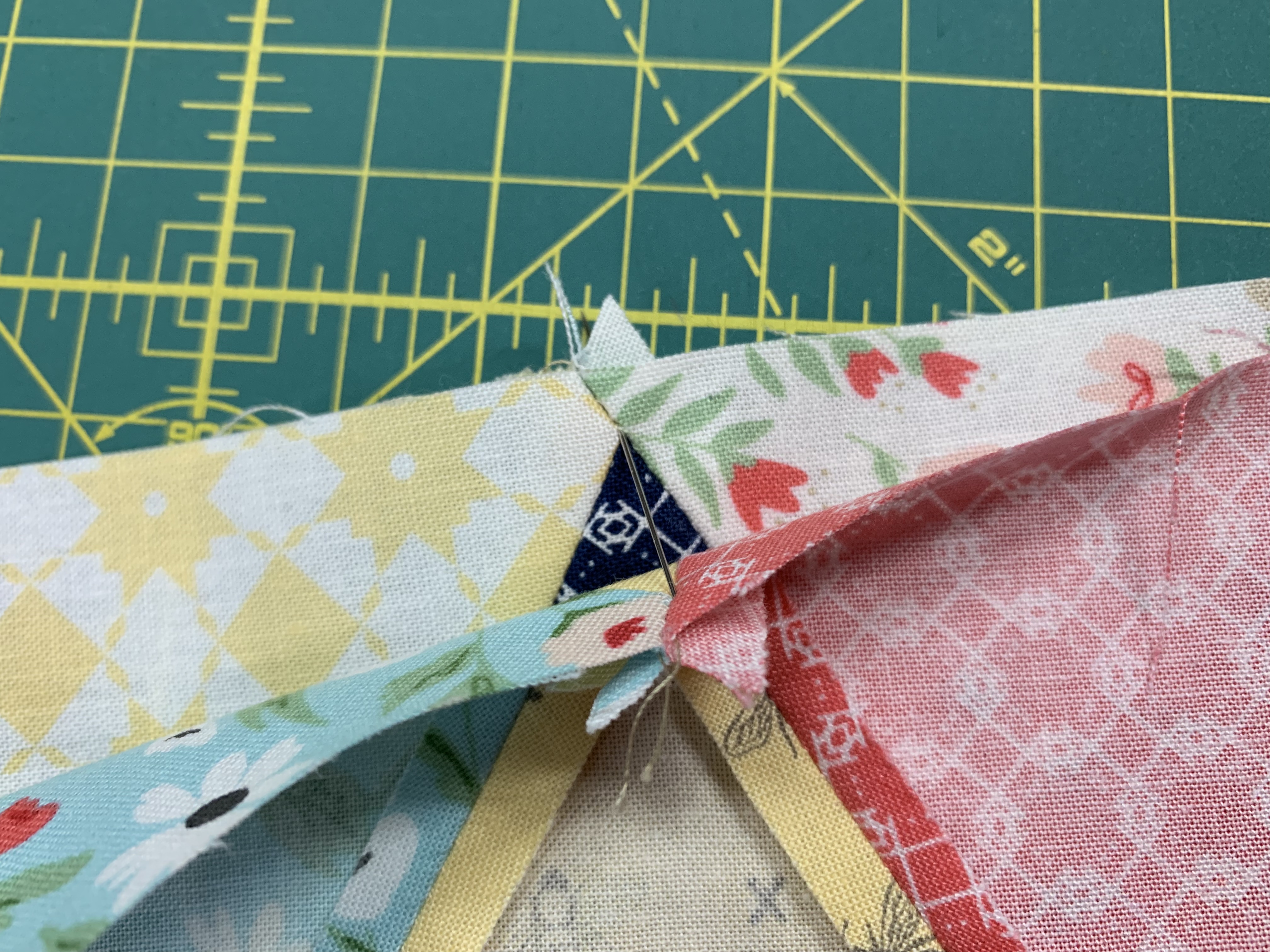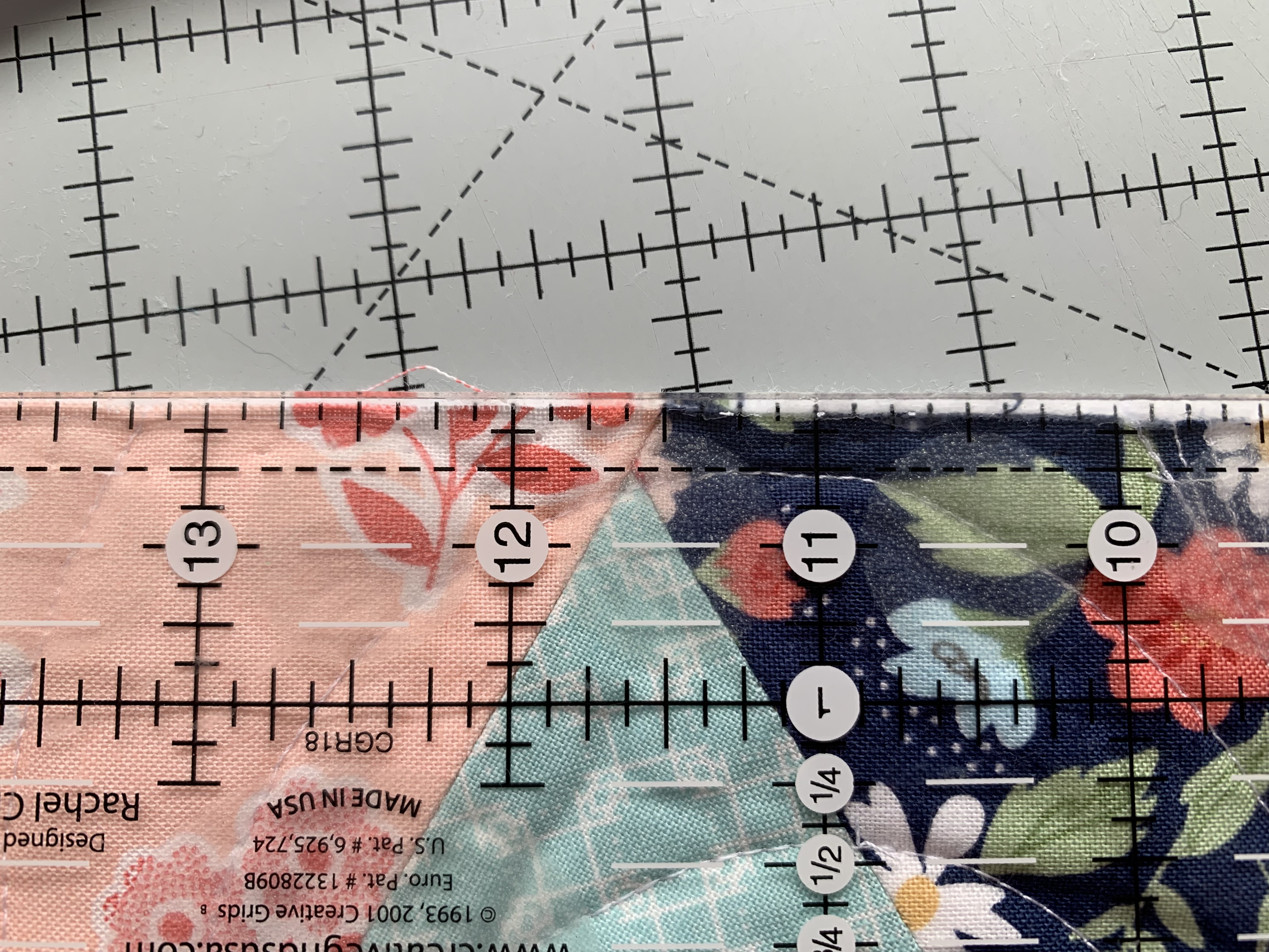 10. Don’t trim your dog ears off until you have the rows finished. This will help with lining up the triangle and give you the point that is ¼ inch away from the edge.